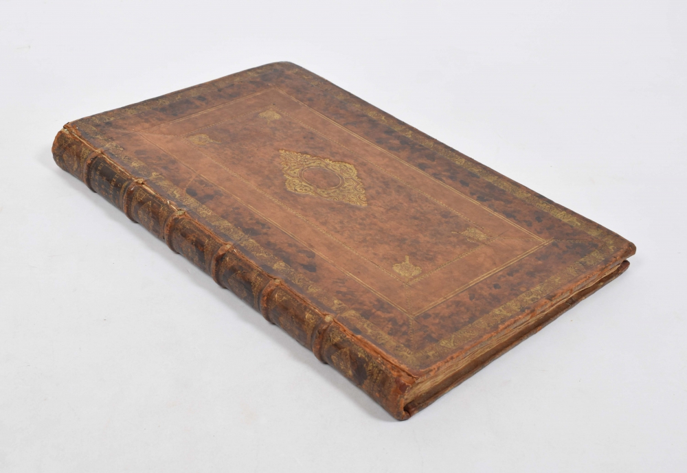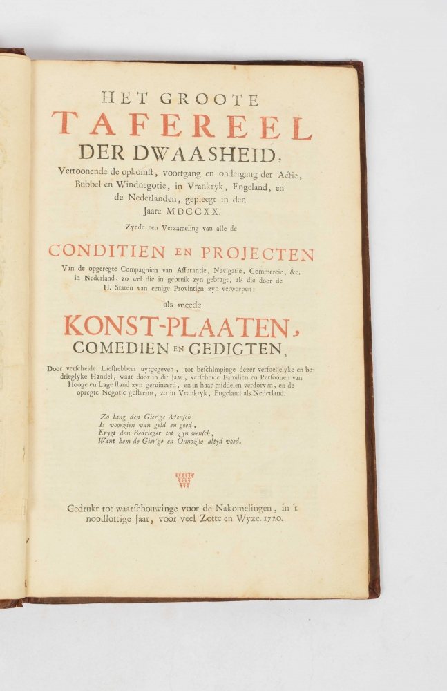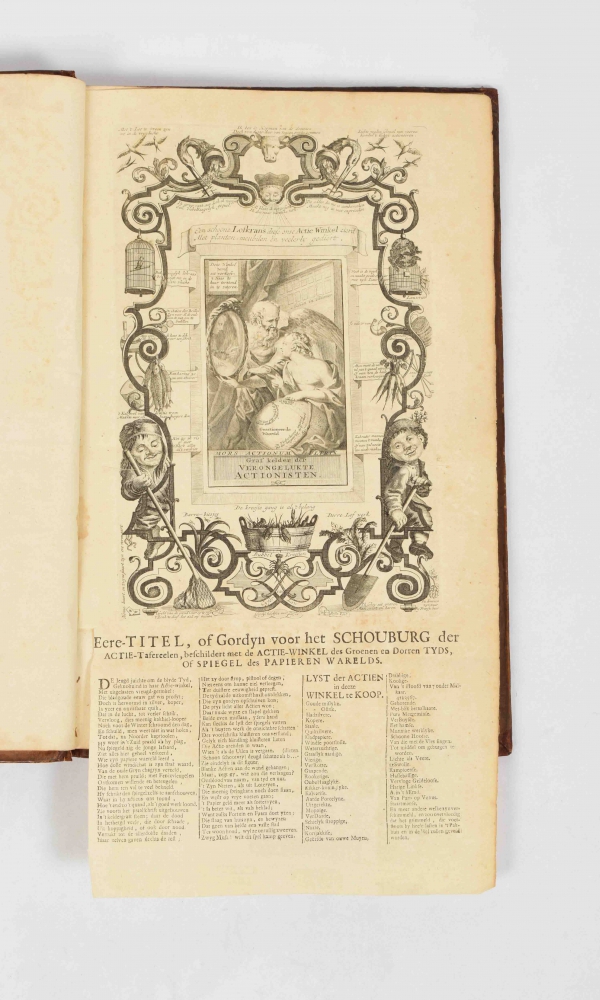 Brown leather binding with gilt stamping on boards and spine, with letterpiece. Consists of four parts: De conditien van de Compagnien van Commercie, 26 pp. + De Windhandel of Bubbels Compagnien. Blyspel, 52 pp. + Versameling van Gedigten (...) op de Buytenspoorige Wind- en Actiehandel... 32 pp. + Papegaay ofte actie-kaart, 8 pp.