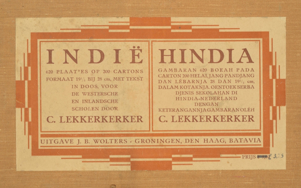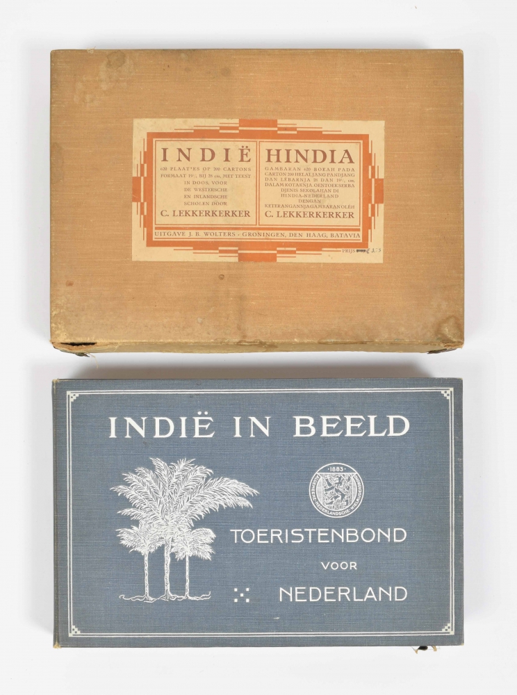 Indië. 620 plaatjes op 200 cartons. 19.5 x 28 cm. Met tekst in doos, voor de westersche en inlandsche scholen. C. Lekkerkerker. J.B. Wolters, Groningen, The Hague, Batavia, [1931]. Hindia gambaran 620 boeah pada carton 200 helai pandjang dan lebarnja 28 x 19.5 cm. dalam kontaknja. oentoek serba djenis sekolohan di Hindia-Nederland dengan keterangannjagambaran oleh C. Lekkerkerker. Original cardboard box with pasted title, inside lid with table of contents; complete with manual and alphabetical register; all pictures with inscription in Dutch and in Malay. Box with traces of use; text and pictures in very good condition.