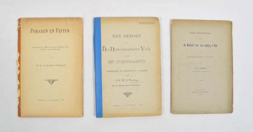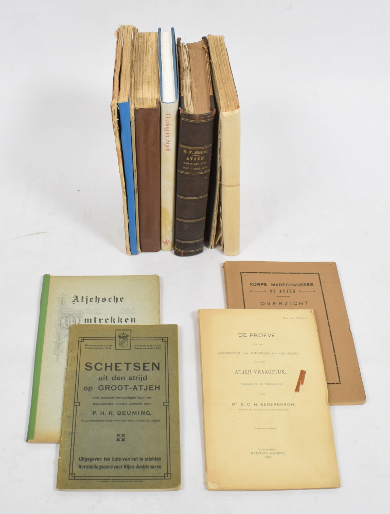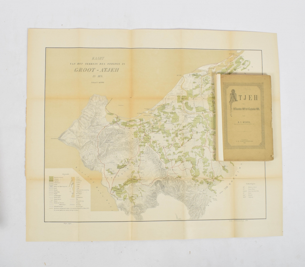 Atjeh van 26 december 1875 tot 4 september 1876. De offensieve handelingen der guerilla. Uit officieele bescheiden samengesteld en met eene kaart, schetsen en plans toegelicht. H.F. Meijer. Breda, P.B. Nieuwenhuys, 1883. Large 8vo, halfleather, title on spine in gilt stamping, with 2 folding sketch maps on cloth; a second copy with paper wrapper, taped on spine with the large folding general map: Kaart van het terrein des oorlogs in groot Atjeh in 1876. Scale 1: 40.000 + 9 more; sold w.a.f.