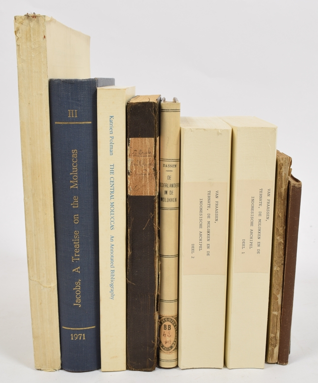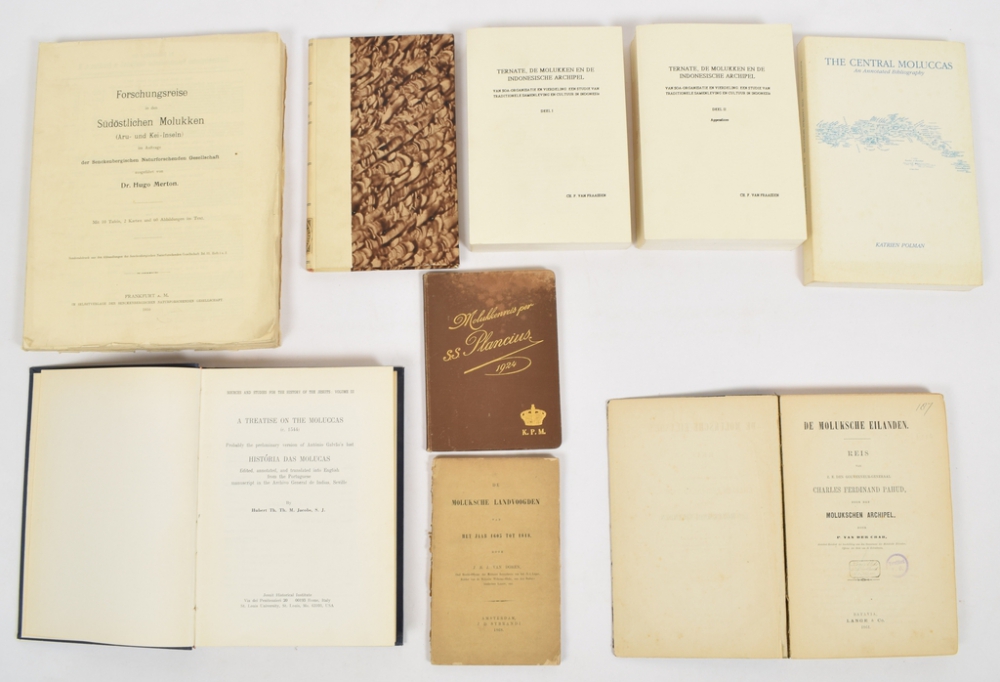 Forschungsreise in den Südöstlichen Molukken (Aru-und Kei-Inseln) im Auftrage der Senckenbergischen Naturfoschenden Gesellschaft ausgeführt von Dr. Hugo Merton. Mit 10 Tafeln, 2 Karten und 60 Abbildungen im Text. Frankfurt a. M., Im Selfstverlage der Senckenbergischen Naturforschenden Gesellschaft, 1910. ix, 208 pp. and plates. In orig. paper binding + De Moluksche landvoogden van het jaar 1605 tot 1818 door J.B.J. van Doren, Amsterdam, J.D. Sybrandi, 1868. 8vo, 138 pp. Worn on spine + De Moluksche Eilanden Reis van Z.E. den Gouverneur-Generaal Charles Ferdinand Pahud, door den Molukschen Archipel. Door P. van der Crab. Batavia, Lange & Co, 1862. xiv, 387, 9 tables and 19 pp. glossary. 4to, in later cloth (early 20th century), stamped 'verwijderd kb' on title page + De Nederlanders in de Molukken. Door M. Dassen H.J. Zoon. Utrecht, W.H. van Heijningen, 1848. 4to, 218 pp. In half cloth + A treatise on the Molucca Probably the preliminary version of Antonio Galvao's lost Historia das Molucas, ed., ann. and translated by Hubert Th. Th. M. Jacobs, Jesuit Historical Institute, Rome, Italy, 1971. 402 pp. Bound in cloth - and 4 more.