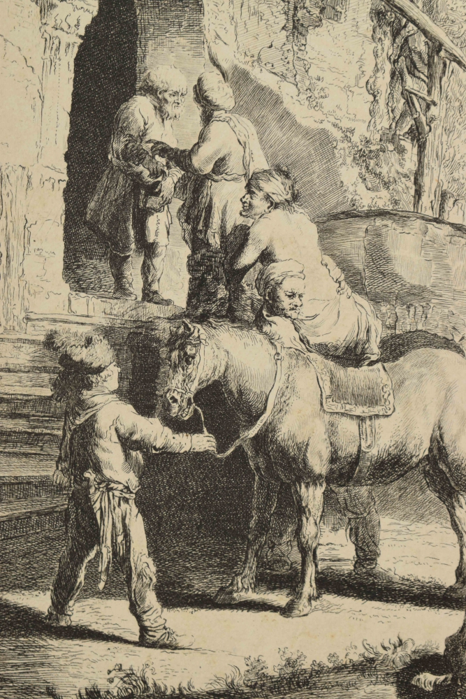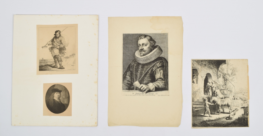 Water stain in top right corner. Very fine portrait from the famous series, on 17th-century paper with watermark and relatively small "construction"; (2) Rembrandt van Rijn (1606-1669) (after). (The good Samaritan). Etching, 24 x 20 cm., printed "Rembrandt in." in foot margin, on probably 18th-century paper (traces of mounting recto and verso); (3) M. Plonski (1778-1812). "Juif d'Amsterdam". Etching, 15.9 x 13.2 cm., signed and "no 10" in print, mounted with top corners to holder (together with one other etching). (total 4)