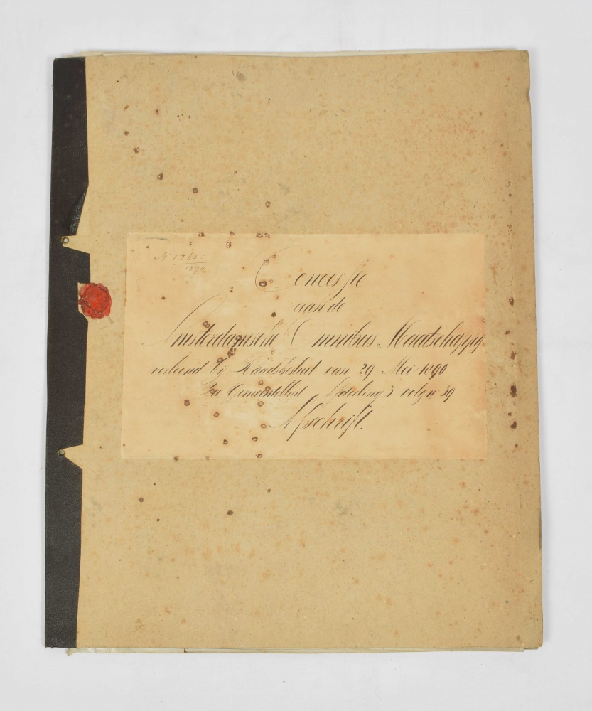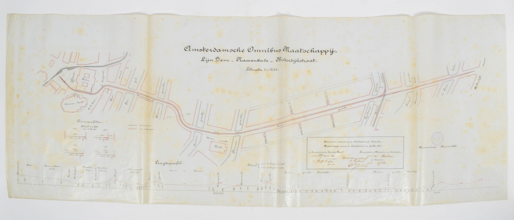 "Verleend bij raadsbesluit van 29 Mei 1890. Zie Gemeenteblad Afdeeling 3 volgn. 39. Afschrift" [manuscript title on portfolio]. Series of 4 manuscript maps in pen and ink and red and blue colouring, drawn in March/ April 1890 on silk, of 4 different Amsterdam omnibus lines, all with stamp of the Technisch Bureau van de Maatschappij, all signed in pen "voor eensluidend afschrift" by secretary Le Jolle who also added copies of the signatures of mayor Gijsbert van Tienhoven and H.G. van der Vies and K.H. Schadd (resp. acting chairman and "admin. dir." of the Amsterdamsche Omnibus Maatschappij), all with height of 53 cm. but varying in length: 129, 144, 216 and 222 cm., loose folded in original portfolio (53 x 43.5 cm.), with manuscript title and red wax seal with the arms of Amsterdam, in tin slipcase.