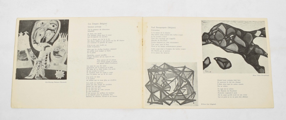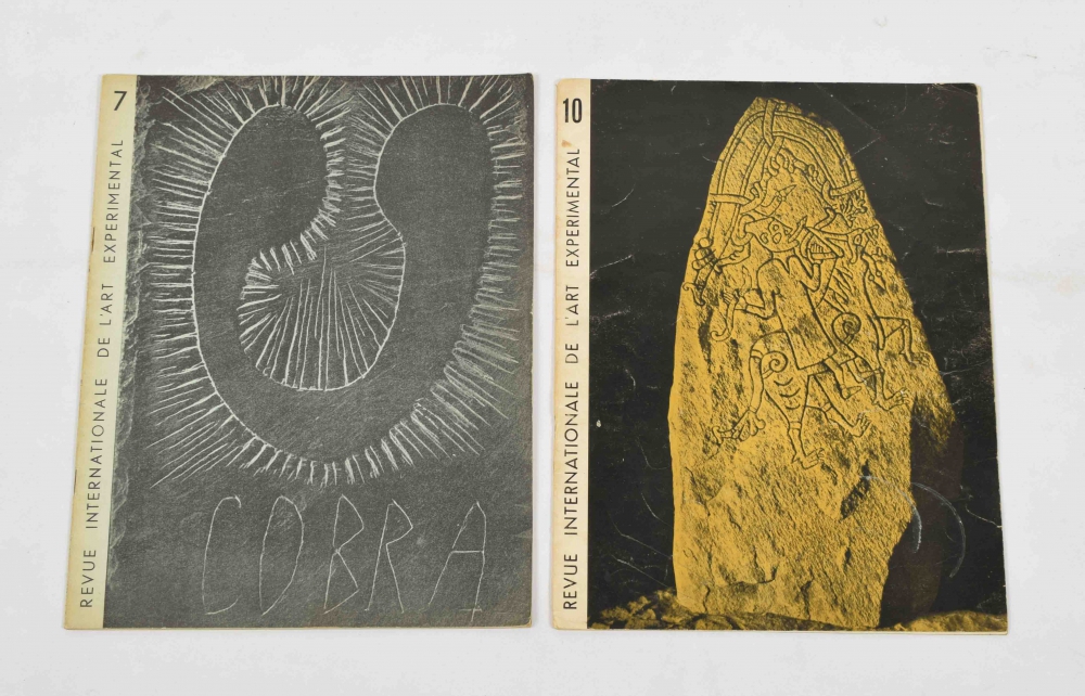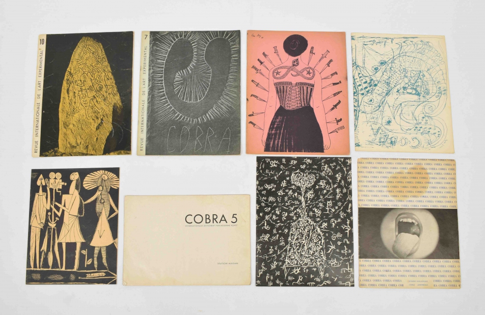 No. 1. Cobra. Bulletin pour la coordination des investigations artistiques, lien souple des groupes experimentaux Danois (Host), Belge (Surrealiste-Revolutionaire), Hollandais (Reflex). (Copenhague, 1949), 24 pp., with colour lithography incl. cover by A. Jorn, E. Jacobsen, E. Bile and C.-H. Pedersen, folio. Clean copy; No. 2. Cobra, 1949, (8) p., cover original linocut Pol Bury. Small folio, clean copy; No. 3. Cobra. Brussels, 1949, (28) pp. Cover lithography Pierre Alechinsky. 4to, clean copy; No. 4. Cobra. Organe du front international des artistes expérimentaux d'avant-garde. Numéro Hollandais. Amsterdam, 1949. 26 pp. 4 plates with children's drawings. Fairly good copy, brown stain to front, loose in wrapper; (No. 5). Cobra. International Zeitschrift für Moderne Kunst. Deutsche Ausgabe. (Hannover), 1950, (28) pp., orig. woodcut O. Hoffmann and M. Olyff. Oblong 4to, with tipped-in leaf with text Asger Jorn on yellow paper and tipped-in lithography Pierre Alechinsky. Front and back cover loose, light traces of use; No. 6. Cobra. Revue bimestrielle de l'internationale des artistes expérimentaux. Brussels, 1950, 25, (3) pp., 4 lithographic plates by P. Alechinsky, Pol Bury, Jan Cox and L. van Lint. Orig. lithographic cover by Roy, folio. Clean copy; No. 7. Cobra. Revue internationale de l'art expérimental. Brussels, 1950, 26, (2) pp., 2 lithographic plates by J. Cox and A. Jorn. Clean copy; No. 10. Cobra. Revue internationale de l'art expérimental. 24 pp. Folio. Cover with some staining, else good. With supplement Charles Estienne Préludes aux noces. 1951. 6 pp. 8vo, with cover design Alechinsky. (total 8)