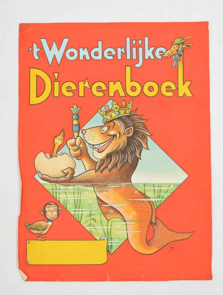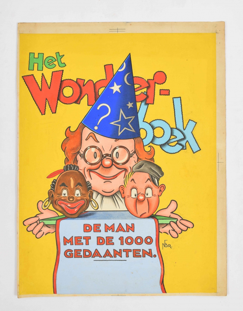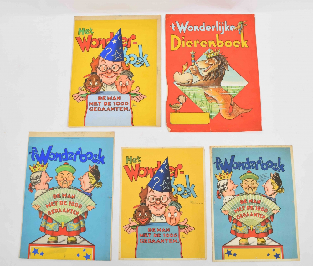 Nico Broekman, c. 1940. 't Wonderboek; de Man met de 1000 gedaanten - and idem (different version). Gouache, 28.5 x 40 cm. (2x) + proof sheets of both covers + 't Wonderlijke Dierenboek. Gouache, 31 x 41 cm.