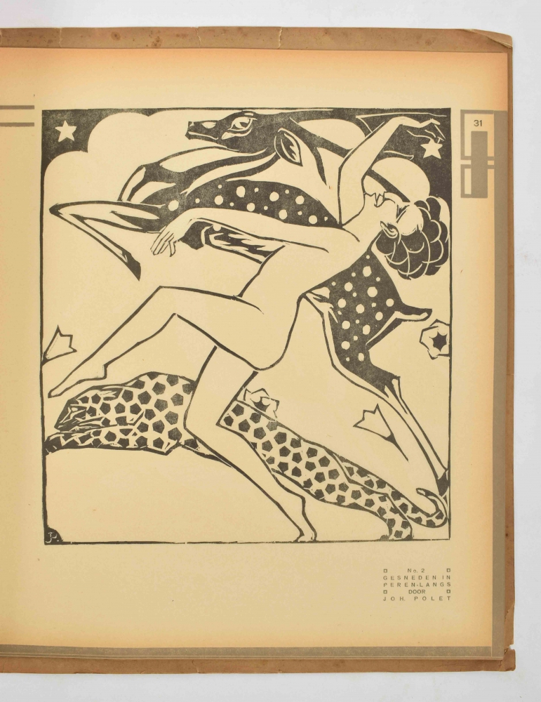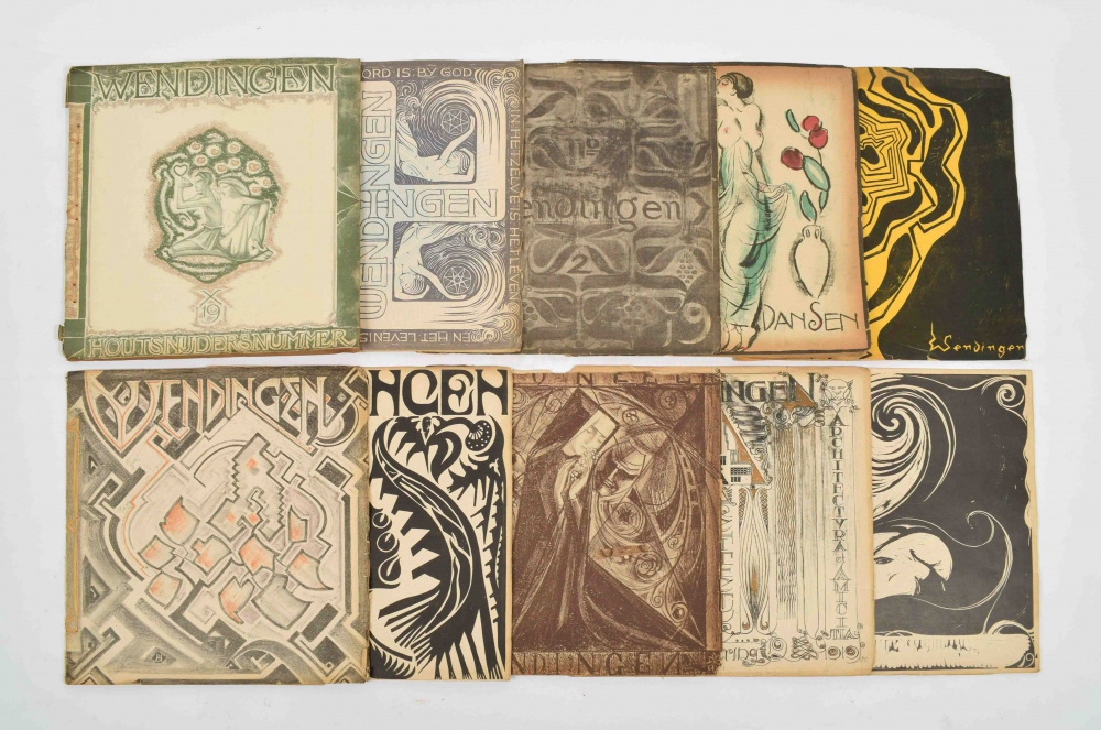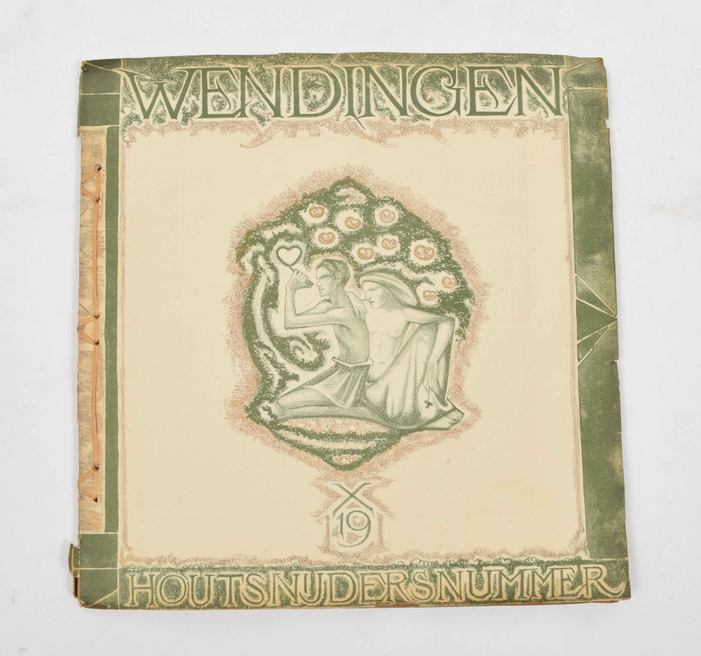 Complete year 1919, ed. by H.Th. Wijdeveld. Raffiabound. 1: Oosterse kunsten; 2: Onze tijd en het Werk van M. de Klerk; 3: Dansnummer; 4: Architectuur; 5: Kunst in de Reclame; 6: Interieur ontwerpen; 7-8: Houtsnedennummer; 9-10: Tooneel; 11: Architectuur; 12: Architectuur. Houtsnedennummer cont. the added woodcut by Lion Cachet and woodcuts of Jan Mankes and others.