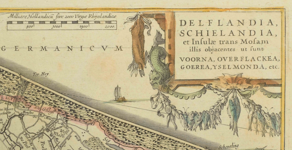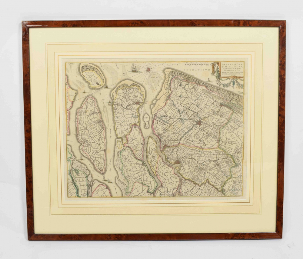 Delflandia, Schielandia et Insulae trans Mosam illis objacentes ut sunt Voorna, Overflackea, Goerea, Yselmonda etc. Willem Blaeu (signed in the map: Guilj. Blaeuw). Amsterdam, c. 1640. Original colouring. Framed in mount under glass. Frame 62 x 73.5 cm.; slightly discoloured.