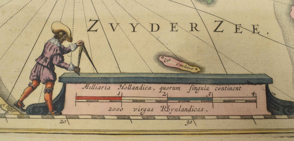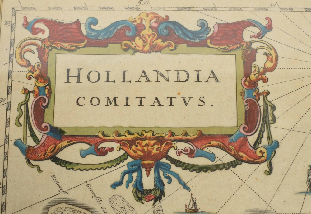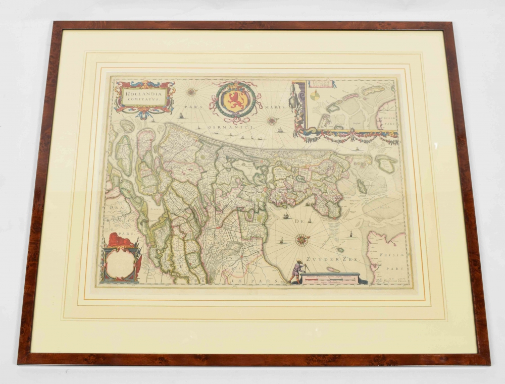 Hollandia Comitatus. Willem Blaeu (signed in map b.r.: Guiljelmum Blaeu). Amsterdam, c. 1640. Original colouring. Various cartouches, arms of the County of Holland, various compass roses and an inset of Wadden Islands Texel, Vlieland and Terschelling. Framed in mount under glass. Frame 63 x 75 cm.