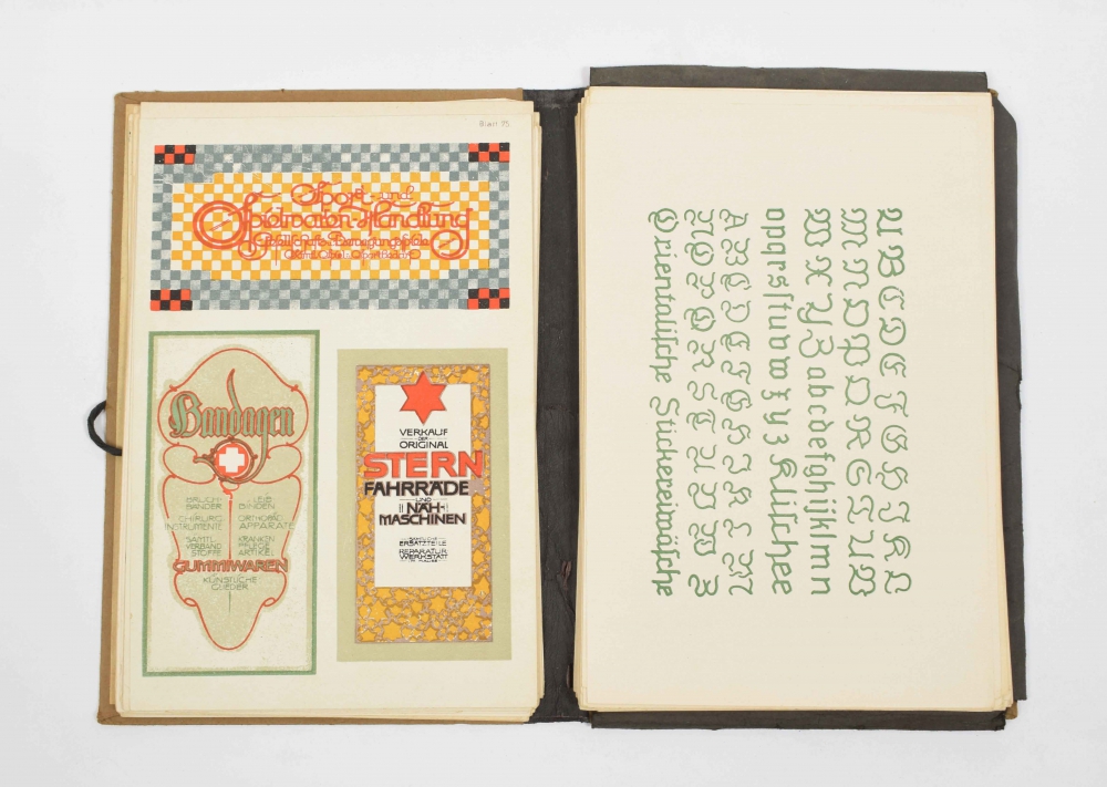 Neue-Schriften Firmenschilder. Kunstgewerbe-Verlag Gerhard & Co, Bielefeld. Halfcloth cordbound file, small 4to, with 73 (of 76) leaves, partly designed by A. Schulze, Berlin-Zürich + Serie 3 from the series, complete with 40 plates - and Serie 4, complete with 40 plates.