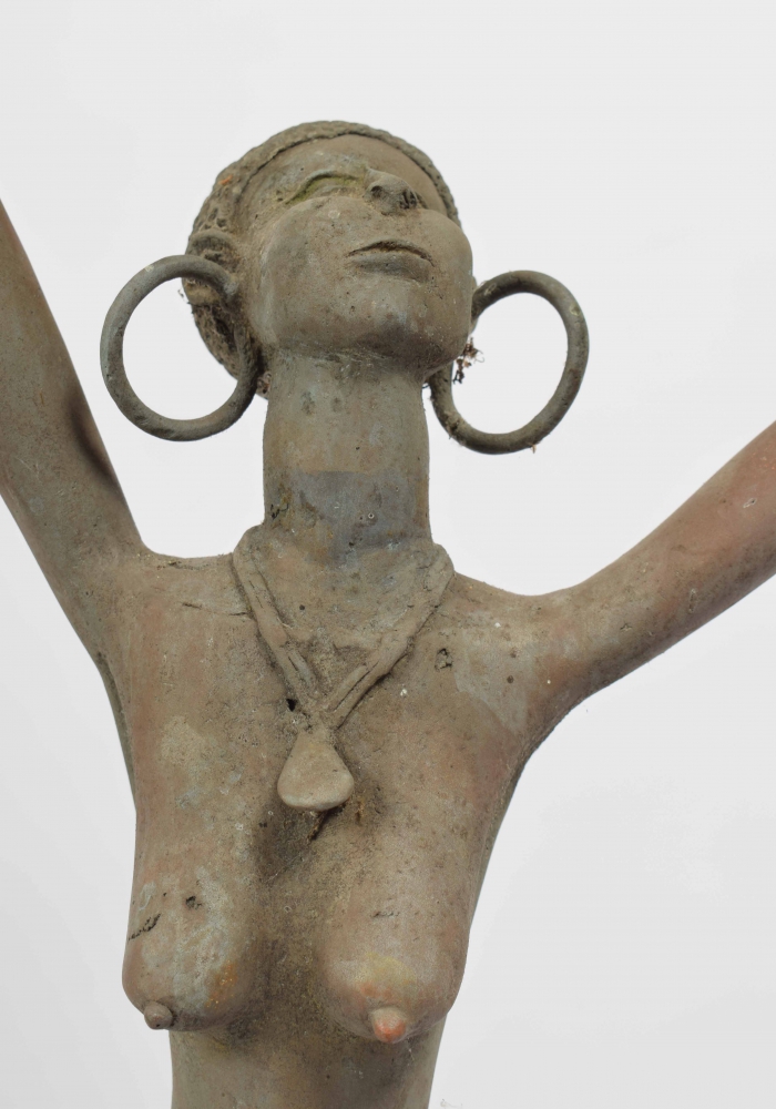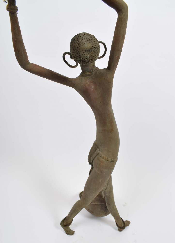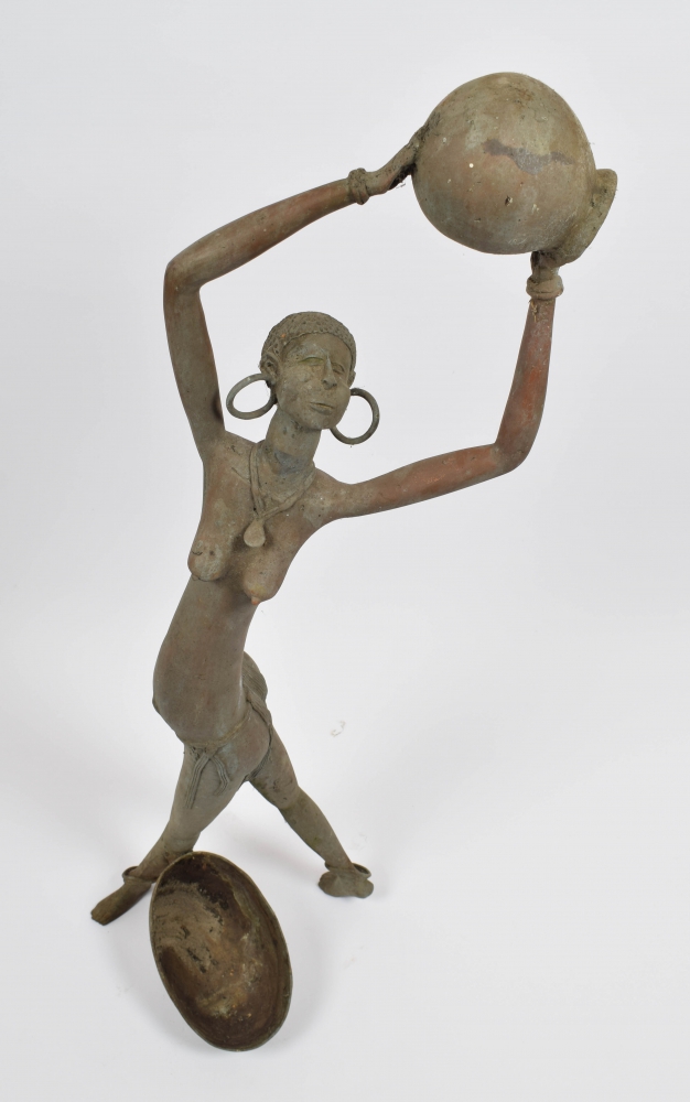 Woman with twisted posture with outstretched hands holding a jar, an open semicircular basket at the left foot. 20th century. Bronze. Height 82 cm.