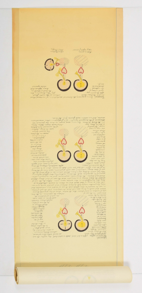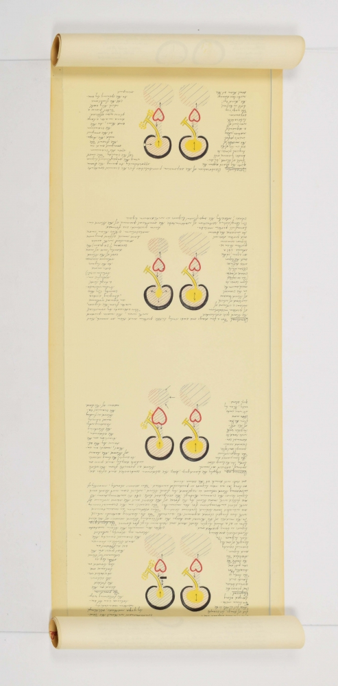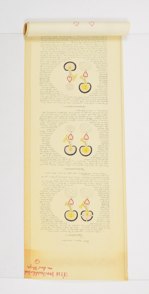 (The Mechanism of brain Blood Volume). (Amsterdam, 1964), scroll-shaped publication, 280 x 44.5 cm., with text in English bordering 10 illustrations, title in red felt-tip pen, illustrations handcoloured in felt-tip pen and with shading in red and blue pen, with at the top dedication "Voor Bert Schierbeek van Bart Huges. No 26" and at the bottom inscription "Made in prison. Copy rights fl.100.000,-, Bart Huges". Copy in exceptionally good condition, brightly coloured without any damage.
