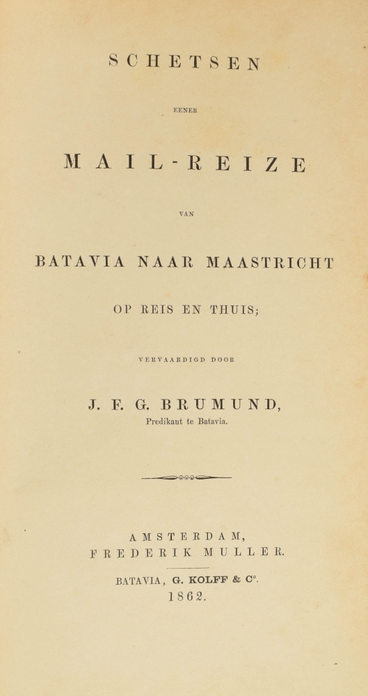 Jan Frederik Gerrit Brumund, Amsterdam, Frederik Muller, Batavia, G. Kolff & Co, 1862. viii, 317 pp. In halfcloth with marbled boards, wear to spine ends and corners.