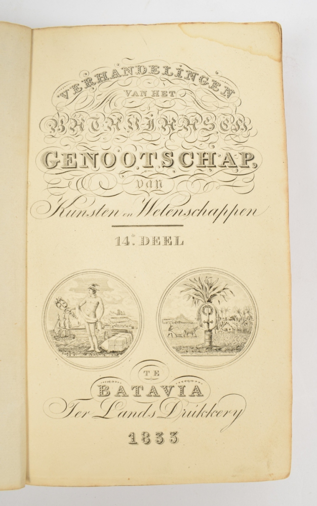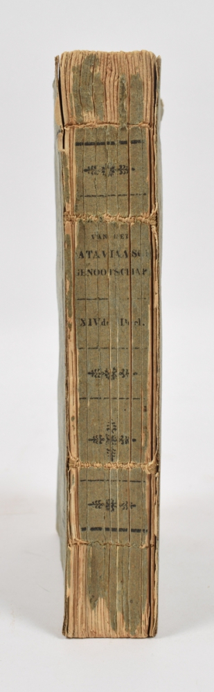 G.F. Meijlan. With: Iets over de acupunctuur (naaldensteekkunde); getrokken uit eenen brief v.d. Japansch-keizerlijken naaldensteker. Isa Saka Sotels. Medegedeeld d. (Ph.F.) v. Siebold. (Batavia, 1833). 2 parts in 1 vol. (12), (4), 377, (1); -379-389 pp. In orig. paper binding, paper split on spine, but bookblock still good (= Verhandelingen van het Bataviaasch Genootschap van Kunsten en Wetenschappen, 14).