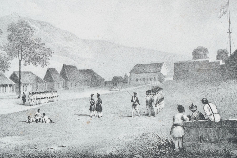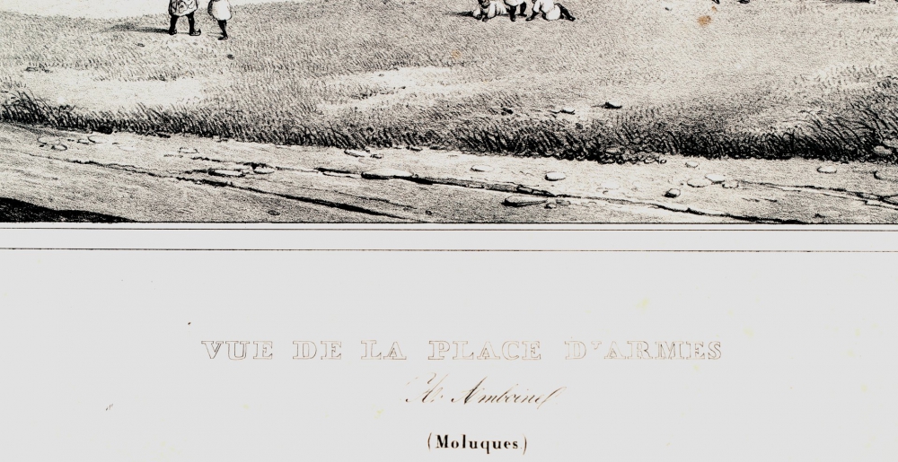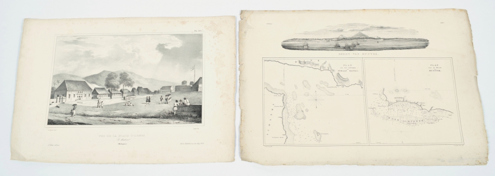 Sainson, Paris, Tastu, 1833. Lithography Jean Baptiste Arnout (1788-). Pl. 133. 23 x 37.5 cm. Some staining to right margin, lithograph in good condition + Gezigt van Muntok (Banka), I. W. Bursten, V. Pistorius, 1832. 32 x 47 cm. Sl. soiled along edges, lithograph in good condition.