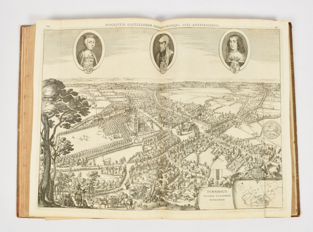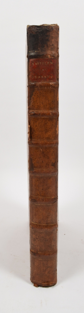 Folio. Halfleather, title on spine in red and gilt stamping, half title, allegorical frontispiece with title and arms of Brabant by Abraham van Diepenbeke, title with large vignette, dedication to the Hoogh Mogende Heeren Staten Generaal with arms of the individual states by H. vander Aa, (6),142(=284) and 108 pp. The 4 quarters of Brabant with general map, 4 portional maps, a plan of Antwerp and 205 views, all in copper engraving by Bouttats, Cause, Harrewijn after Bauduin, Hollar, Van Croes, Van Wierden etc. The armorial chart of Den Bosch trimmed short, the maps of Leuven and Brussels folding. The bound-along part with title, dedication, general map of Brabant as before and 7 views, all in copper engravings. Castles and houses in the first part all with captions in Latin, French and Dutch. Spine with minor dam., endpaper browned, bookplate. All prints in strong impressions. Copy on large paper. Scarce in this composition.