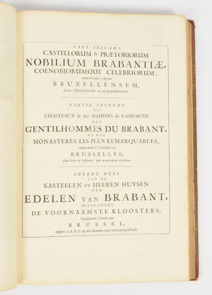 Castella & Pretoria Nobilium Brabantiae, coenobiaque celebriora, ad vivum delineata, in quatuor partes divisa: complectentes agrum Lovaniensem, Bruxellensem, Antverpiensem et Sylvae-Ducensem. Chateaux et maisons de campagne des Gentilhommes de Brabant et les monasteres les plus remarquables / Kasteelen en heeren huysen der Edelen van Brabant (etc.). (...) ex museo Jacobi Baronis Le Roy, & Sacri Romani Imperii, Toparchae Sancti Lamberti. Leiden, Pieter vander Aa, 1699. Bound with: L'Erection de Toutes les Terres, Seigneuries & Familles Titrees du Brabant. Leiden, the same.