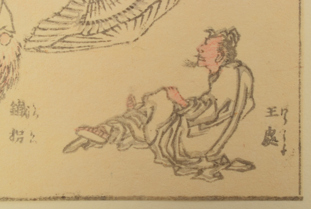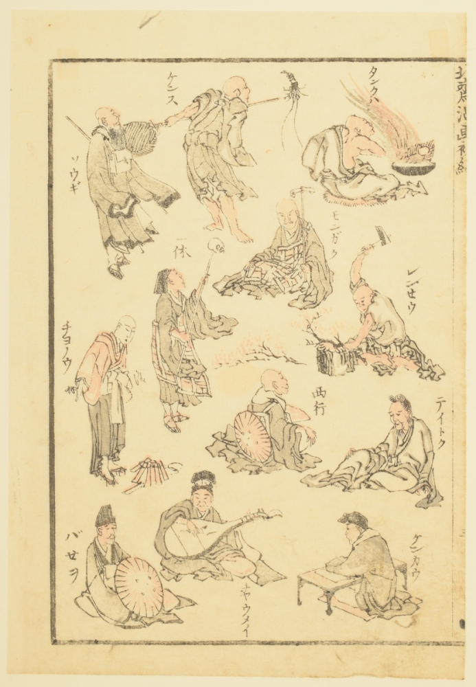 With subjects: Japanese from all walks of life in various postures, animals and plants, spear practice and a small boat overwhelmed by a tsunami. With 1 more: colour woodcut of 2 women with baskets by Hasegawa Konobu (in mount). (total 11)