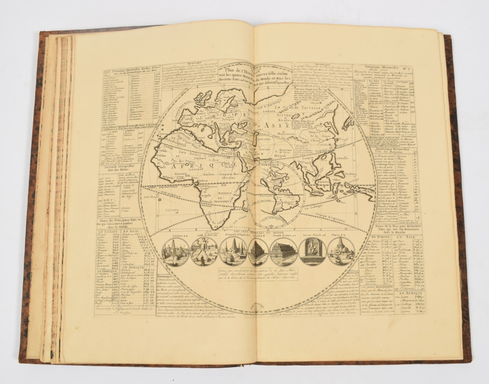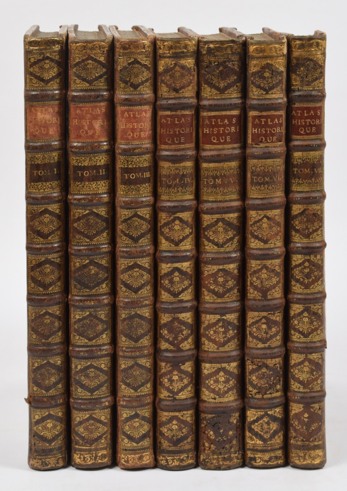 Complete; all vols. with maps and genealogical tables with coats of arms. Vol. I incl. world map and heraldic maps and vol. VI with the spectacular folding map in 4 leaves: Carte Tres Curieuse De La Mer Du Sud Contenant Des Remarques Nouvelles Et Tres Utiles Non Seulement Sur Les Ports Et Isles De Cette Mer. Mais aussy sur les principaux Pays de l'Amerique tant Septentrionale que Meridionale avec les noms & la route des voyageurs. The 7-vol. atlas with mild browning to leaves, vol. VII with heavier browning, else light traces of use and occ. staining; vol. VI with worm holes at the end. (total 7)