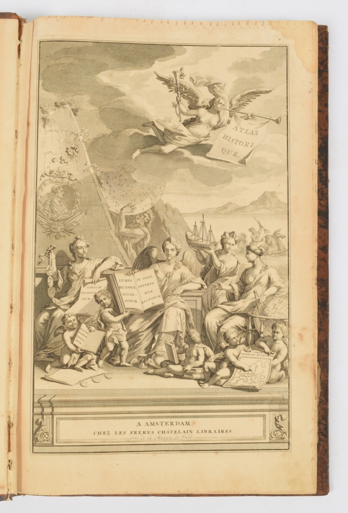 Atlas Historique ou nouvelle introduction a l'Histoire, à la Chronologie & à la Geographie Ancienne & Moderne: Représentée dans de Nouvelles Cartes (...) par Mr. C*** avec des dissertations sur l'Histoire de chaque Etat, par Mr. Gueudeville. Seconde Edition. Tome I-VII. Amsterdam, Les Freres Chatelain, 1713-1720. Large folio, leather, 7 vols., uniformly bound, spine with title in red and gilt stamping, endpapers, 3x allegorical frontispiece by Goeree, Schijnvoet and Sluyter, 7x title in red and black with various vignettes by Goeree.