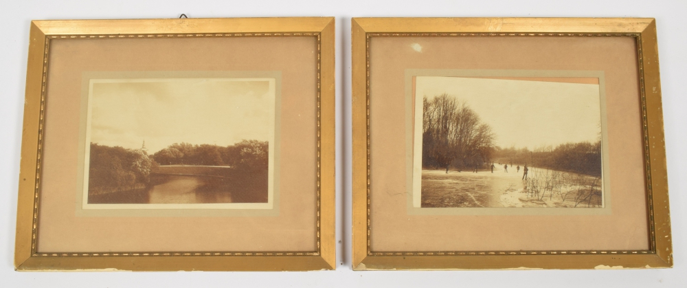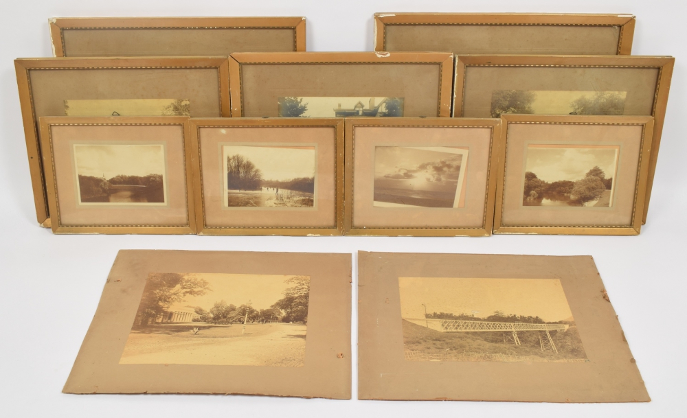 3 larger size photos of a house in the Indies, one of a bridge (damaged) and one of the Borobudur. Resp. 22 x 28 and 16.5 x 23 cm. - and 5 photos by the same source from The Hague. All c. 1910-1920. Most in frame.