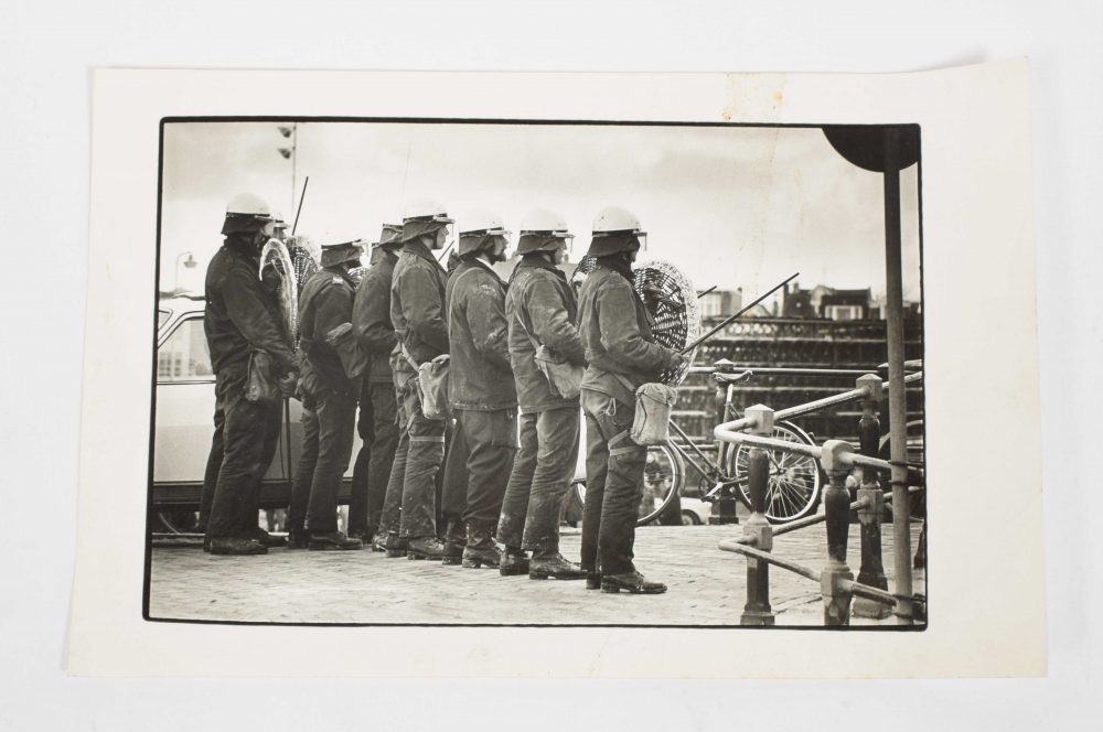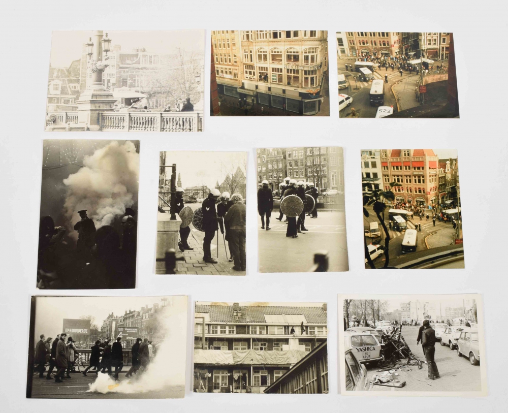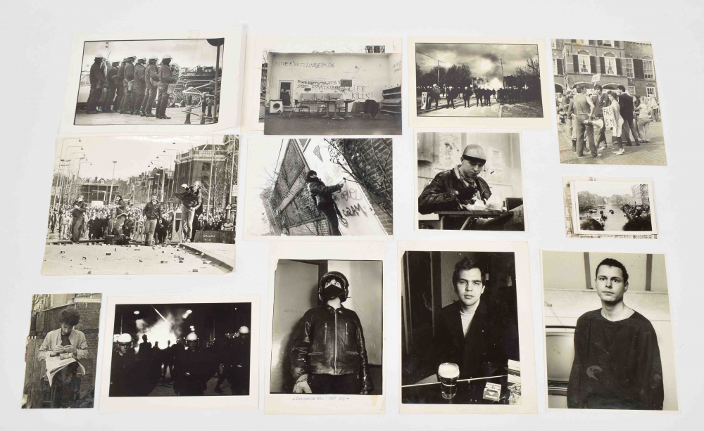 Collection of 32 photos related to squatting and riots in the first half of the 80s, Amsterdam. Most without stamp, several with photographer's stamp of Vincent Mentzel on reverse.