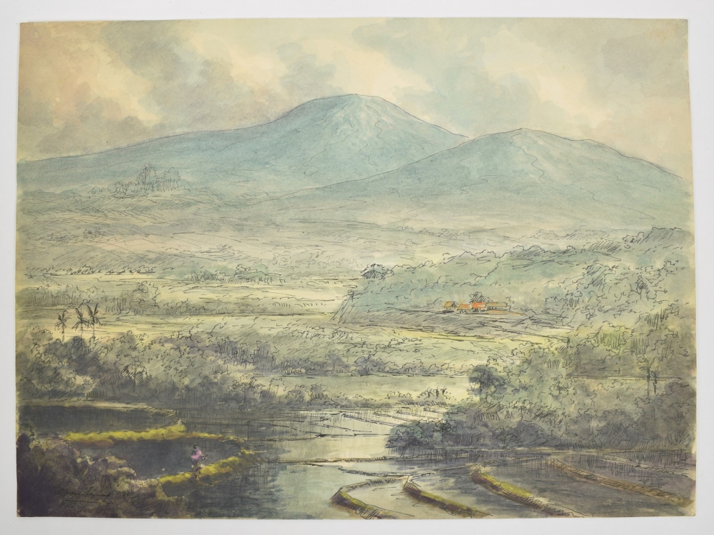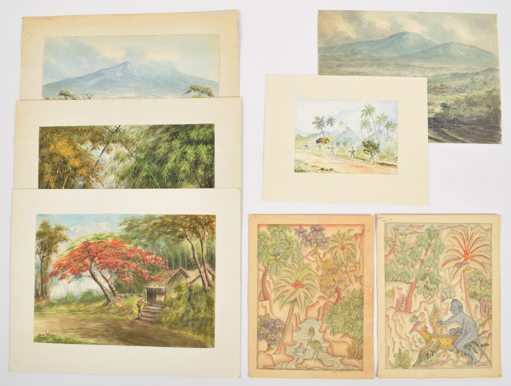 (3-4) Mountain landscapes. Two drawings in pen and ink, finished as watercolours, 28 x 38 cm., both unclearly signed b.l. and with attribution "Van Strien" on reverse/ holder, one with corners affixed to holder; (5) J.L. Evers (20th century). Soldiers on patrol. Watercolour, 17 x 24 cm., signed and dated "'48" b.l., in mount (police actions). And with 2 more (Balinese gouaches). (total 7)