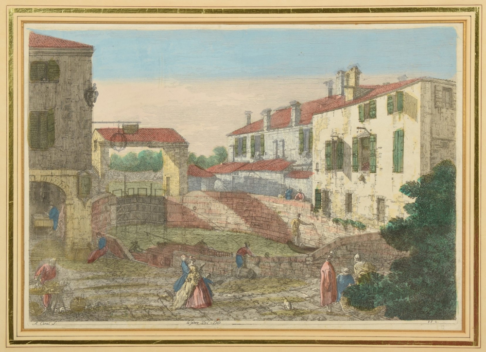 De Vesme and Bromberg 6, 3rd and last state. Famous etching by Canaletto, antiquely coloured in the style of optical prints.