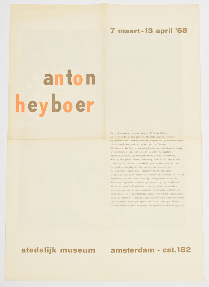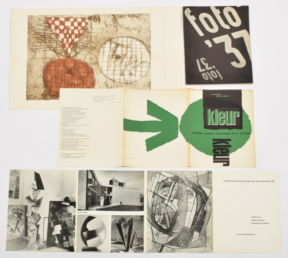 Anton Heyboer. Stedelijk Museum Amsterdam, catalogue 182. Folding brochure/ poster, 7 March-13 April '58 + André Bloc, Claude Parent, Charlotte Perriand. Stedelijk Museum Amsterdam cat. 183, March-April '58. Art et Architecture. Folding brochure for the exhibition. 8 pp. (= front and back) + Prisma der kunsten; De tentoonstelling foto '37. Ed. Wim Brusse with contr. by Paul Schuitema, Emmy Andriesse, L. Moholy-Nagy, Dick Elfers, Cas Oorthuis et al. Slightly shaky in binding, light dam. to top and spine ends + Kleur. Stedelijk Museum 8/11-8/12-1958. Lay-out Wim Strijbosch.