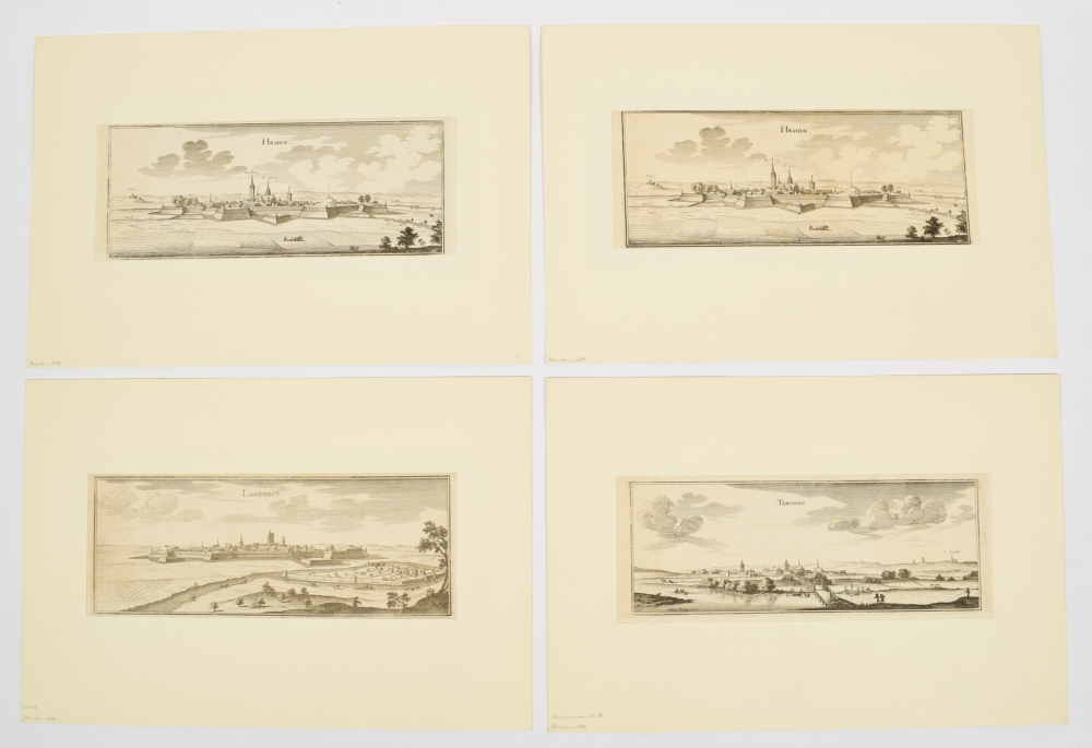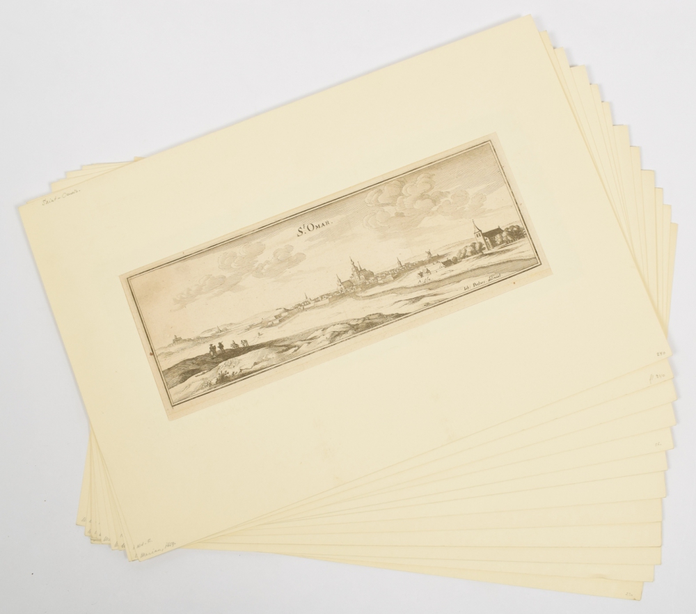 [France/ Belgium] Series of 13 engraved city profiles from Merian, 1659,