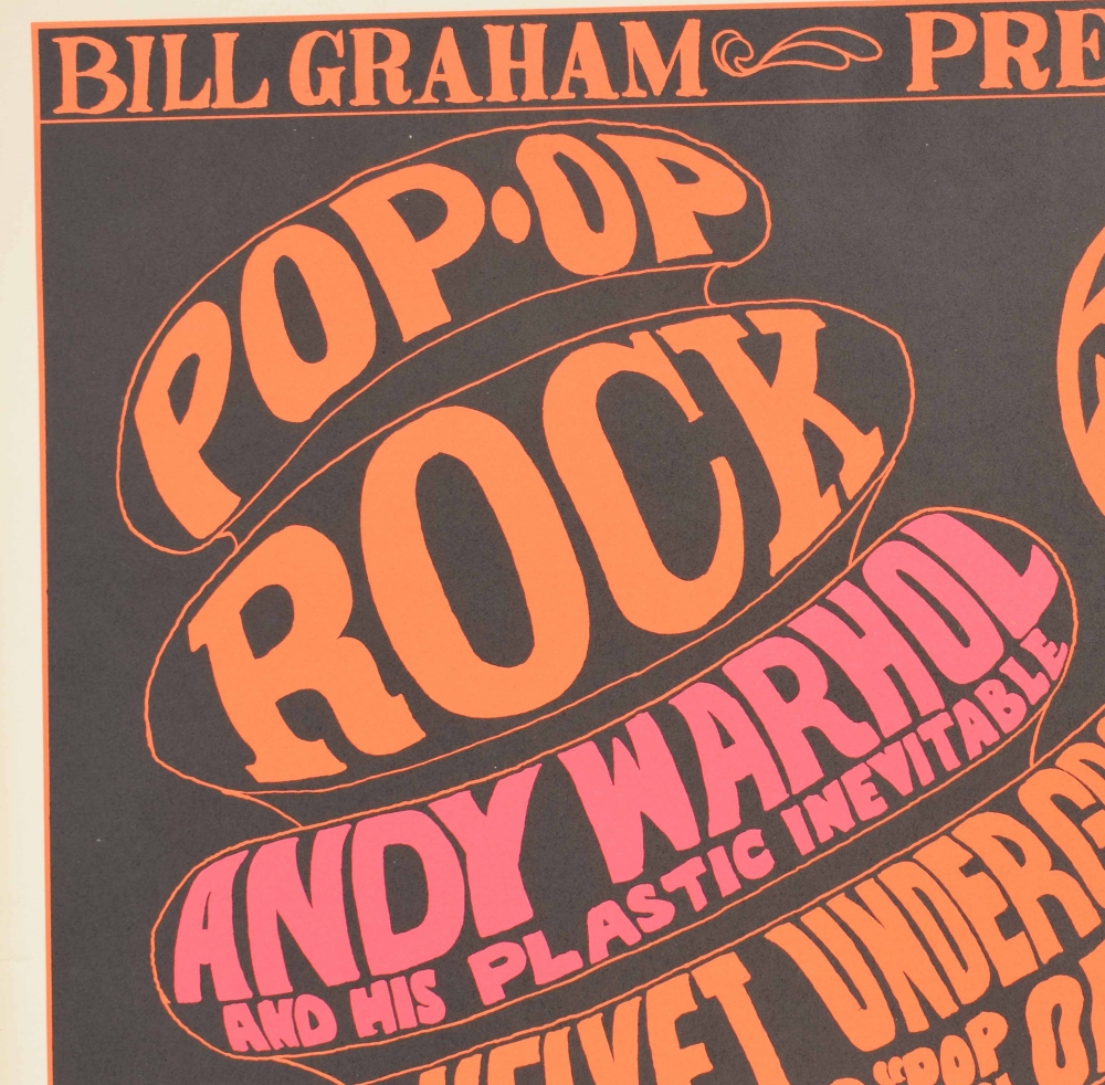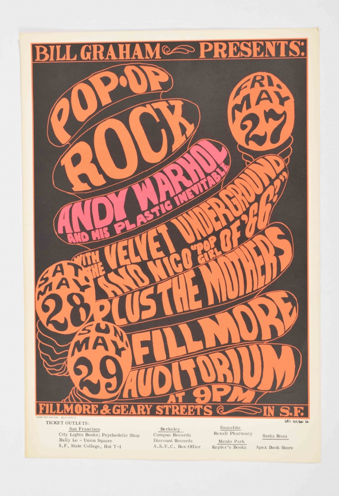 Bill Graham presents: Pop-op Rock. Andy Warhol and his plastic inevitable with the Velvet Underground and Nico "Pop girl of '66?" plus the mothers Fillmore Auditorium at 9 p.m. Wes Wilson, 1966. 51 x 35.5 cm. Good copy.