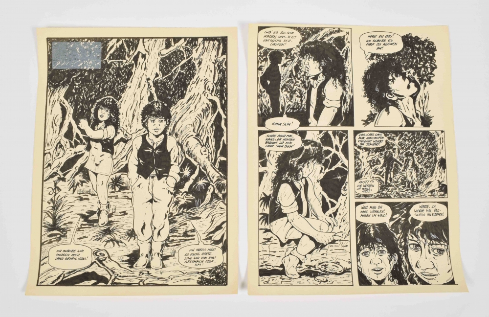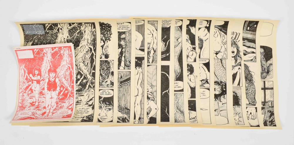Erotic/ pornographic story in 13 original pages in India ink after Hansel and Gretel. Pages each 30 x 40 cm. With added the printed version (12 of 13 pages) on A4-size.