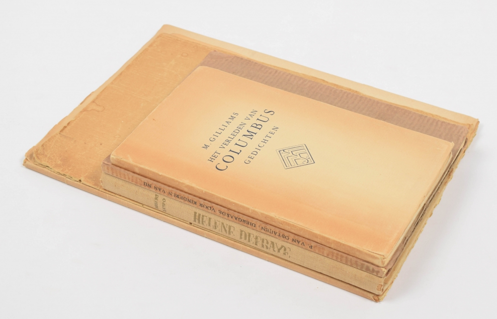 Paul van Ostaijen. Diergaarde voor kinderen van nu. Antwerp, De Sikkel, 1932. 1st ed. 85 pp., original wrapper. Front cover with min. stain + Hubert Lampo. Helene Defraye. Brussels, A. Manteau, [1944]. 230 pp., original halfcloth with gilt title. With dedication in ms. by the author to Tonny van der Horst + Maurice Gilliams. Het verleden van Columbus: gedichten. Amsterdam, Meulenhoff, 1938. 72 pp., original wrapper. No. 85/500 and signed by Gilliams. Bookplate Hendrik Jan Scheepmaker to inside front board + idem. Het Maria leven: gedichten. Antwerp, De Nederlandsche Boekhandel, 1942. 42 pp., original wrapper with dust jacket, 4to. No. 65/250 on Ingres, signed by Gilliams + 1 more.
