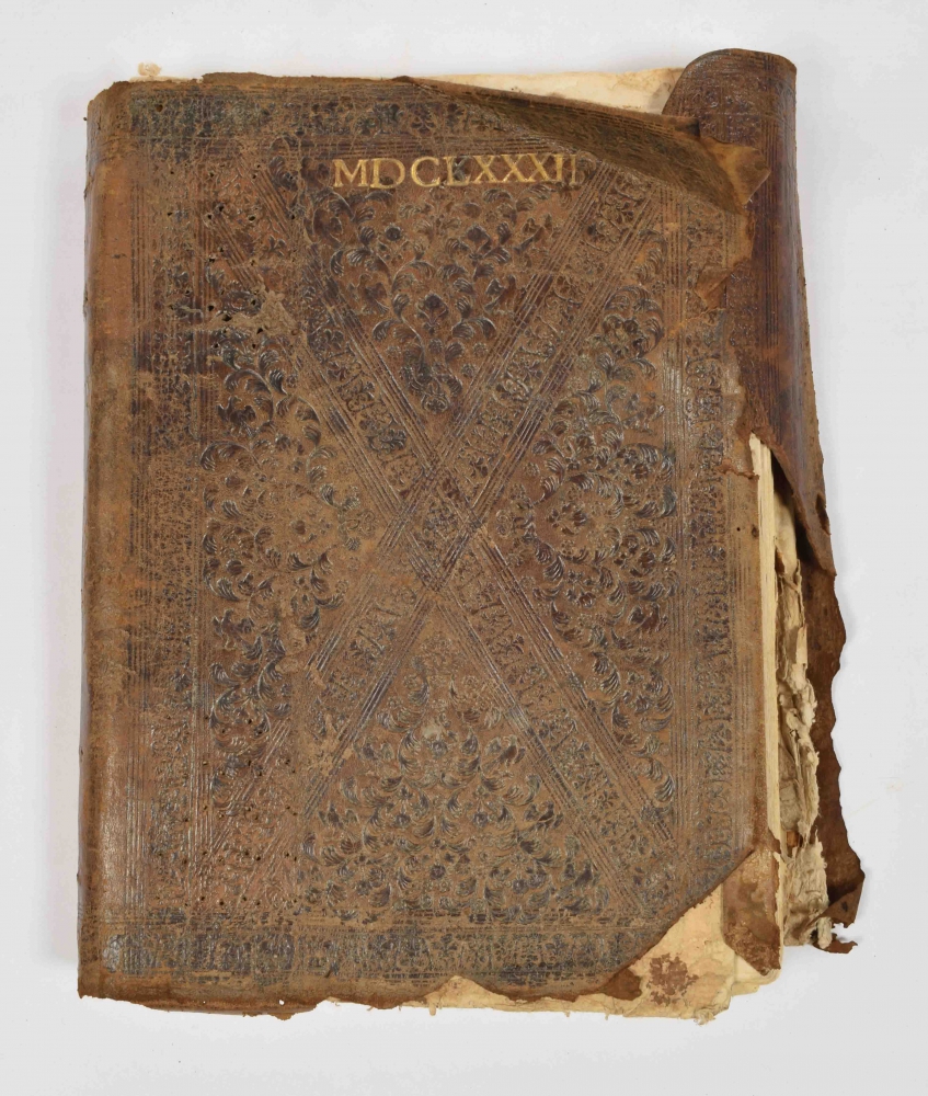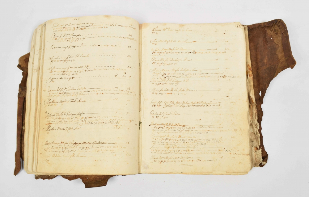 Binding heavily affected by damp, leather loose from damaged boards and partly lacking. Bookblock still fine, besides the damp-affected head margin in the first 30 leaves, with loss to paging. A few leaves tender or loose, occ. leaves torn out, paging occ. omits numbers. Highly extraordinary, possibly unique list of names of the Compagnia del Santissimo Sacramento. We were unable to trace the location where this list was compiled. This book deserves a thorough restoration.