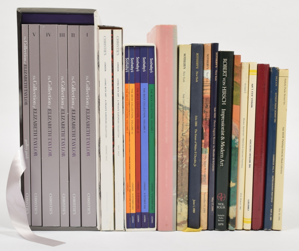 Christie’s London and New York. Incl. The Collection of Elizabeth Taylor. New York, 2011, 5 vols. and Gallery Guide, complete in cassette, 4to + Christie's The Collection of Victor and Sally Ganz. New York, 1997. 230 pp. 4to, cloth with dust jacket + 3 more + Sotheby's The Beck Collection. German Expressionist & Modern Art. London, 2002. 5 vols. complete in cassette, 4to + 9 more.