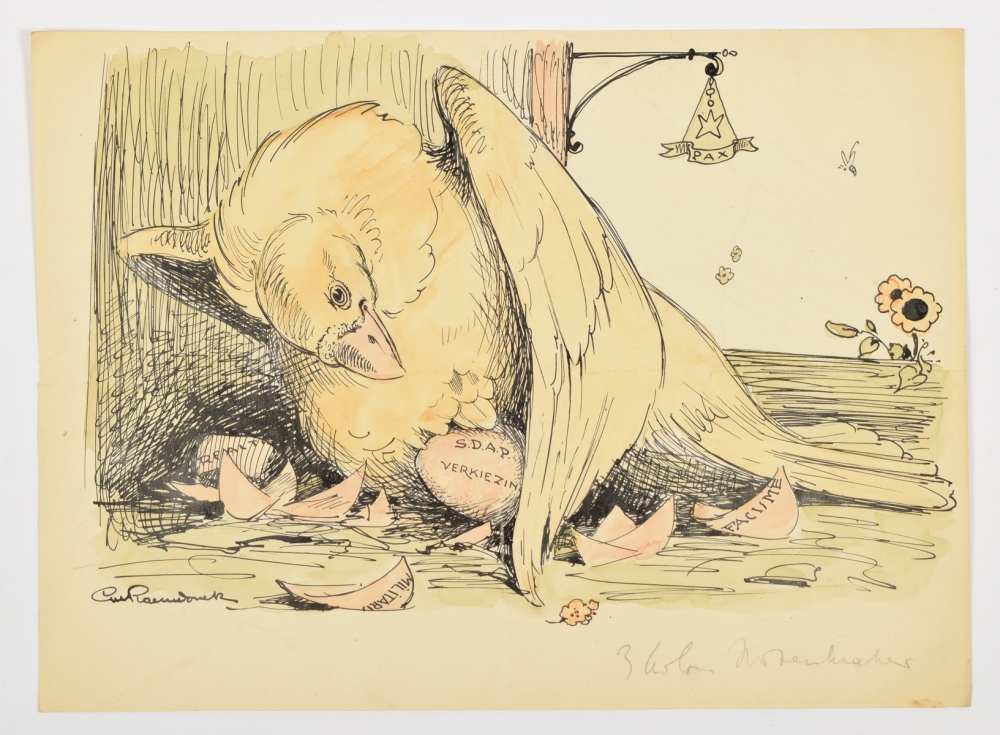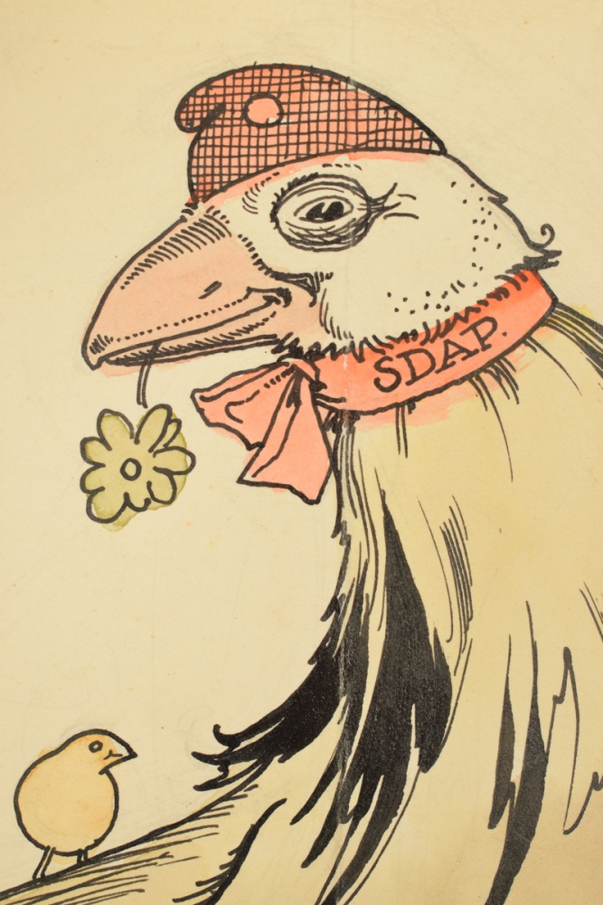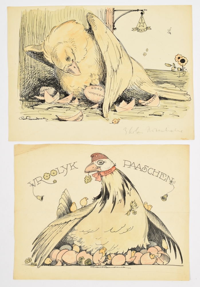 S.D.A.P. Two cartoons in India ink with watercolour. (1) S.D.A.P. Verkiezingen; (2) Vrooyk Paaschen. Both 25 x 32 cm. Made as illustrations for De Notenkraker magazine.