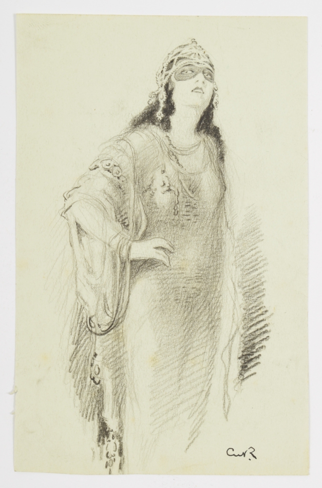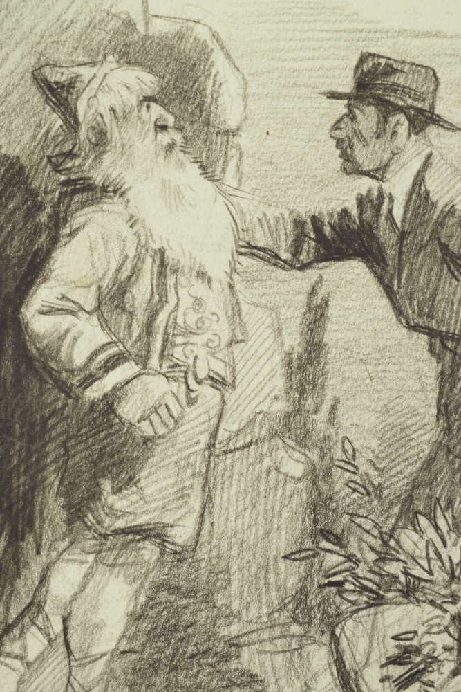 3 book illustrations and a pencil sketch. 10 'Schoft je hebt mij bedrogen'. 17 x 14 cm. + 'Aan den ingang van de zaal stond, als een Koningin, de vrouw met het roode masker'. 18 x 12 cm. Both pencil on paper + Market vendors. India ink. 26 x 21 cm. - and a sitting figure. Pencil sketch. 21 x 14 cm.