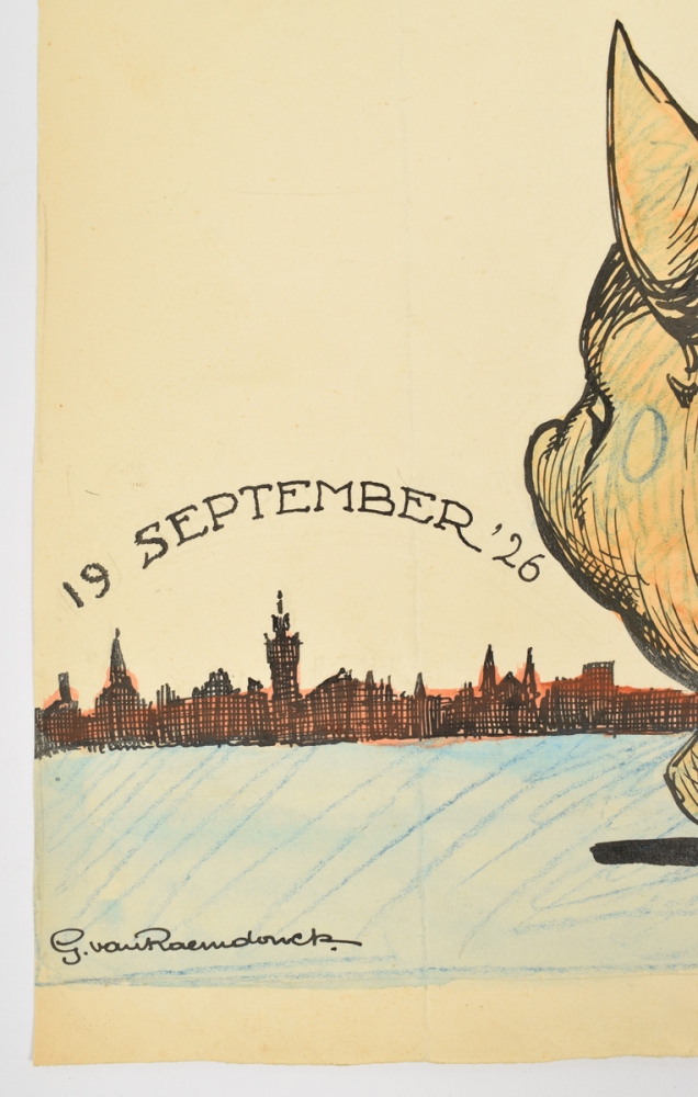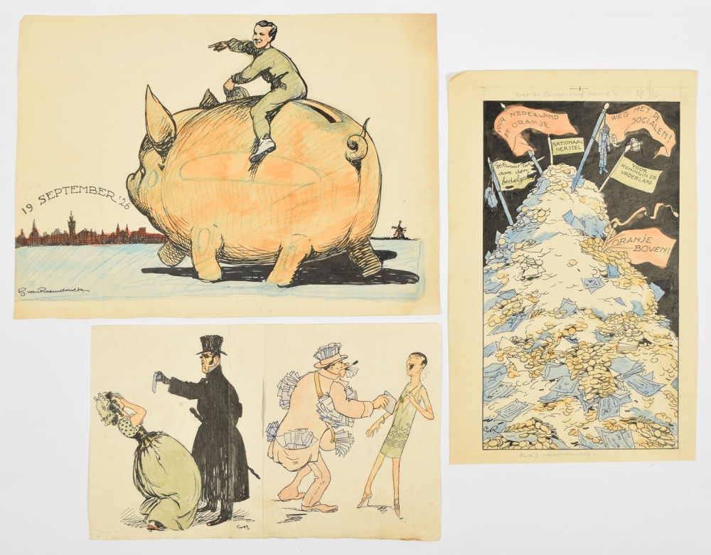 'Wat de Burgerdeugd waard is. Oud's navordering.'* 29 x 19 cm. + 'De Deurwaarder vroeger en thans' Volgens de Rsb. zijn aan het 3e kantoor der Dir. Belastingen te Den Haag niet minder dan 60.000 dwangbevelen uitgereikt.' 16 x 26 cm. + 'Op weg naar Den Haag'. 22 x 32 cm. All in India ink with watercolour.