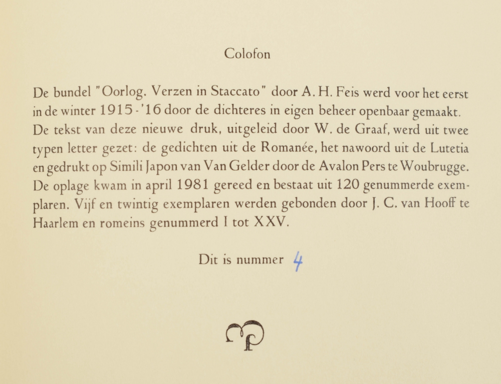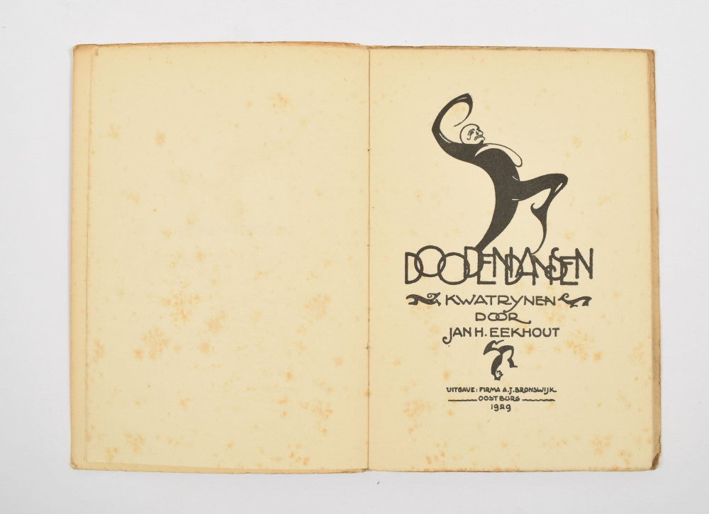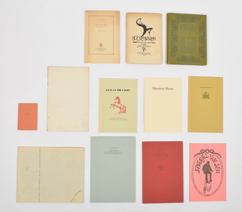 Originally published as an article in Bouwkundig Weekblad, 1916; (2) A.H. Feis. oorlog. Verzen in Staccato. Uitleiding W. de Graaf. Ibid., idem, 1981, 120 numbered copies on Simili Japon van Van Gelder (95), 47,(4) p., orig. wrapper, large 8vo; (3) Janus Gruterus. Heroicae Musae. Zoeterwoude, De Uitvreter, 1999, printed in a limited edition on Zerkall weiss gehämmert, orig. cordbound wrapper; (4) Constantijn Huygens. Over boeken. (Zoeterwoude), De Uitvreter, 1996, printed in 125 copies on Zerkall-Bütten antik jutemeliert, (4) p., bifolium loose as issued in orig. wrapper; (5) Johan H. van Eikeren. Over de aesthetische kant van uw vak. Een lezing. Amsterdam, De Buitenkant, 1990, printed in 300 copies, 20 p., orig. wrapper, 24mo; (6) Doodendansen. Kwatrynen door Jan H. Eekhout. Oostburg, A.J. Bronswijk, 1929, 47 p., with 2 woodcut illustrations by Jan Mels, orig. wrapper. Foxed, with "ter bespreking" in pen on flyleaf. And with 6 various other works. (total 12)