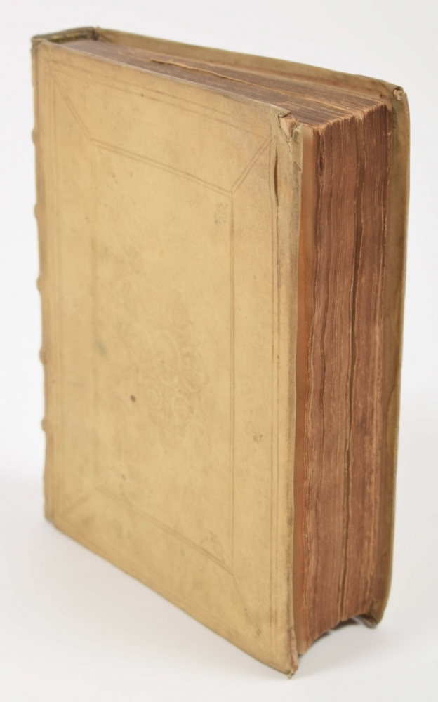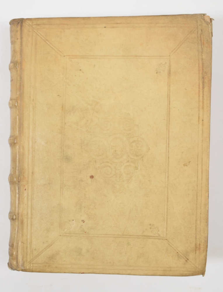 Bevattende een verhaal van stads grondlegginge, waterstroomen, vryheeren (...). J.W. [= Ignatius Walvis]. Gouda, J. & A. Endenburg/Leiden, Christiaen Vermey, 1714. 2 parts in one vol. (22),376,200,(4) pp. 2 identical woodcut title vignettes, folding engr. plan, 4 folding engr. views and 1 folding portrait. Blindstamped vellum, 4to.