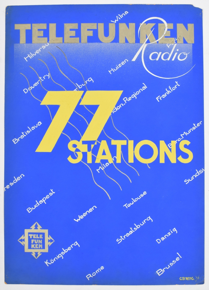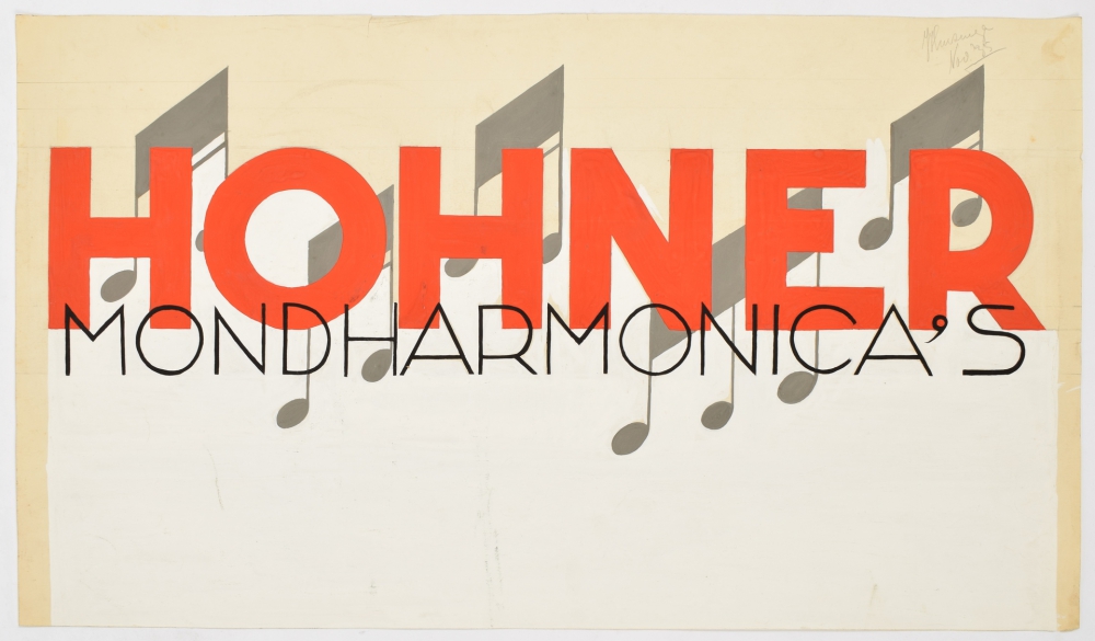 (2) "Bi-Arlita. Opnieuw tot 20% besparing Philips". Original design in gouache, with incorporated, pasted reproduction, signed "P. v. Sijtsema" top right, 27.5 x 47.5 cm.; (3) "Hohner Mondharmonica's". Original design in gouache, signed "J. Huizinga Nov. '35" top right, 37.5 x 65 cm. (minor defects); (4) "Telefunken Radio. 77 stations". Original design in gouache on thick paper, signed "C. Streng '36" bottom right, 68 x 48.5 cm. (one top corner dam.). And with 2 similar works on Junghans Uurwerken and Wijnhandel Paul Sorbi (The Hague). (total 6)