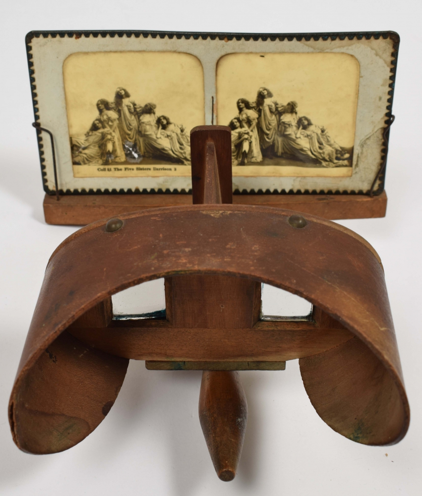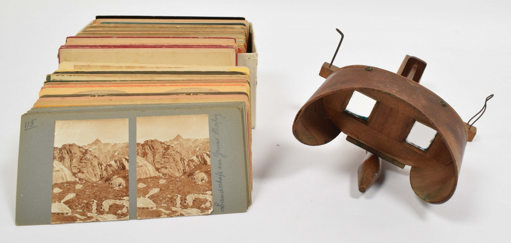 Stereoscope, c. 1920, wood. Length 32 cm., width 18 cm. With 167 stereocards with images of European topography, incl. France, Switzerland and Italy, Florence, a series of 34 cards conc. Paris, forests, ruins and costume.