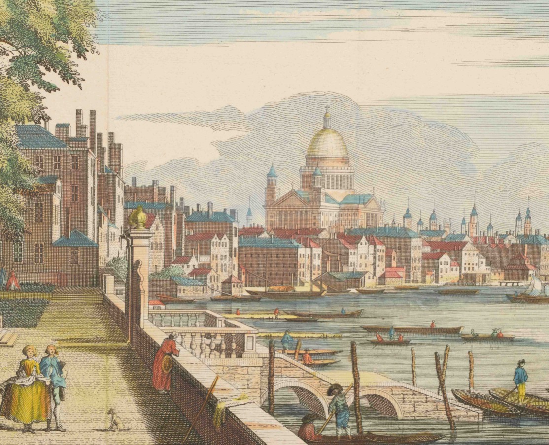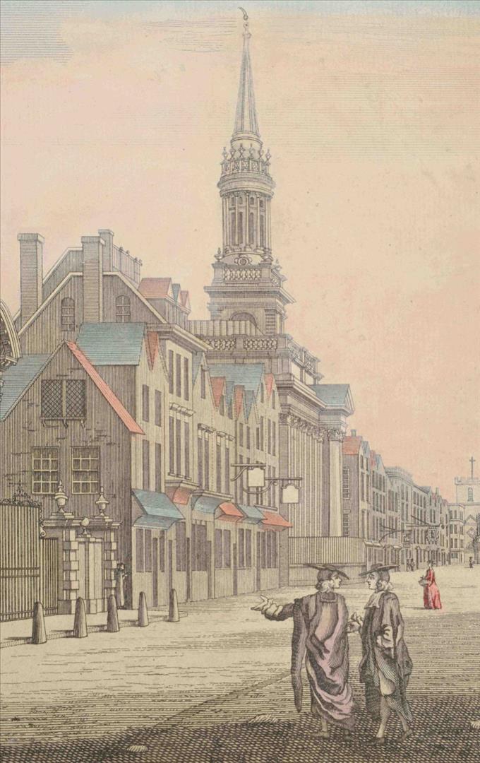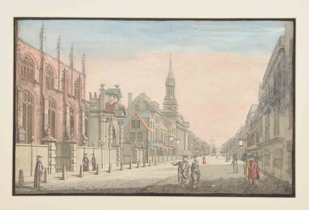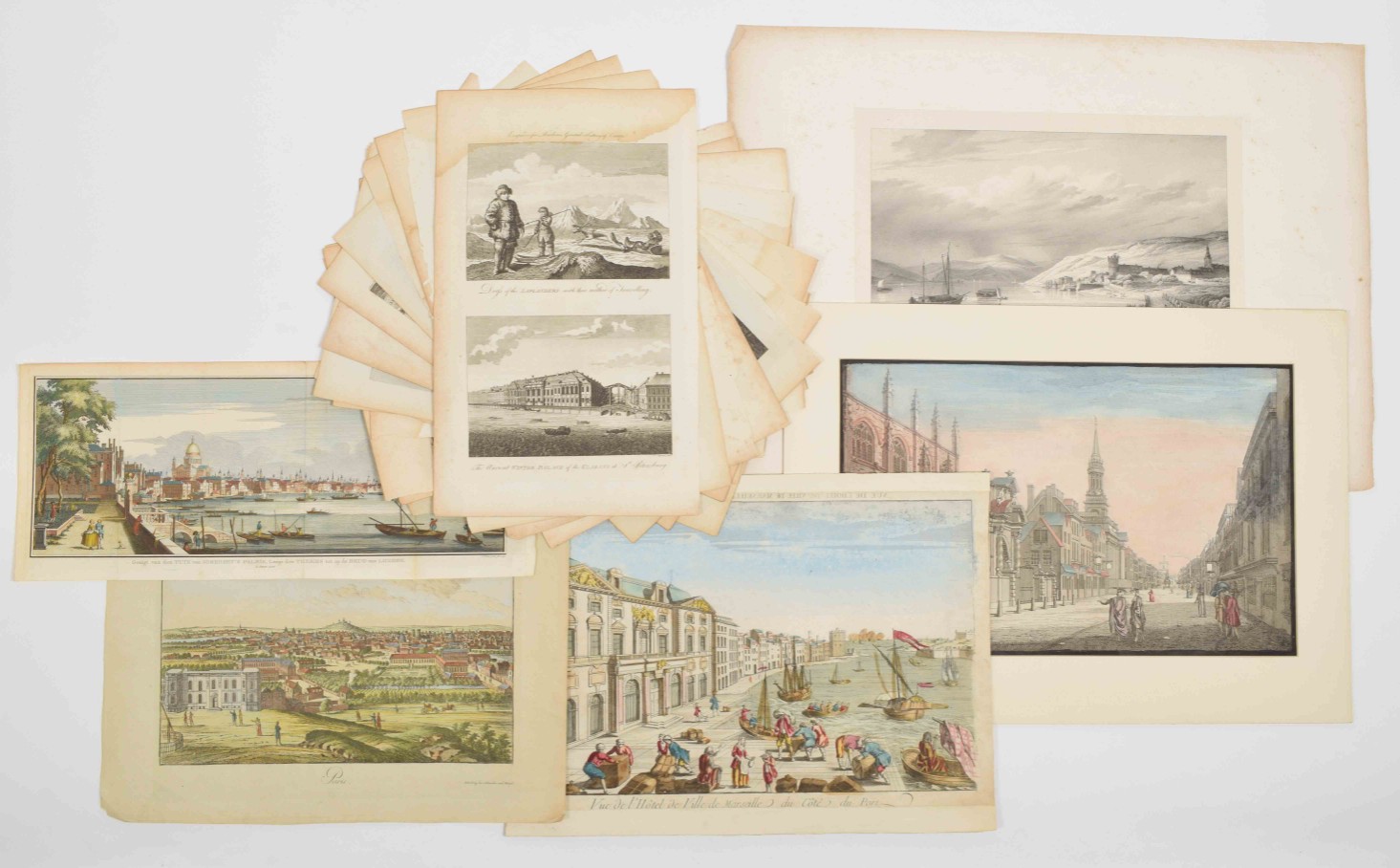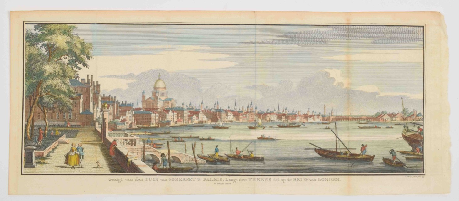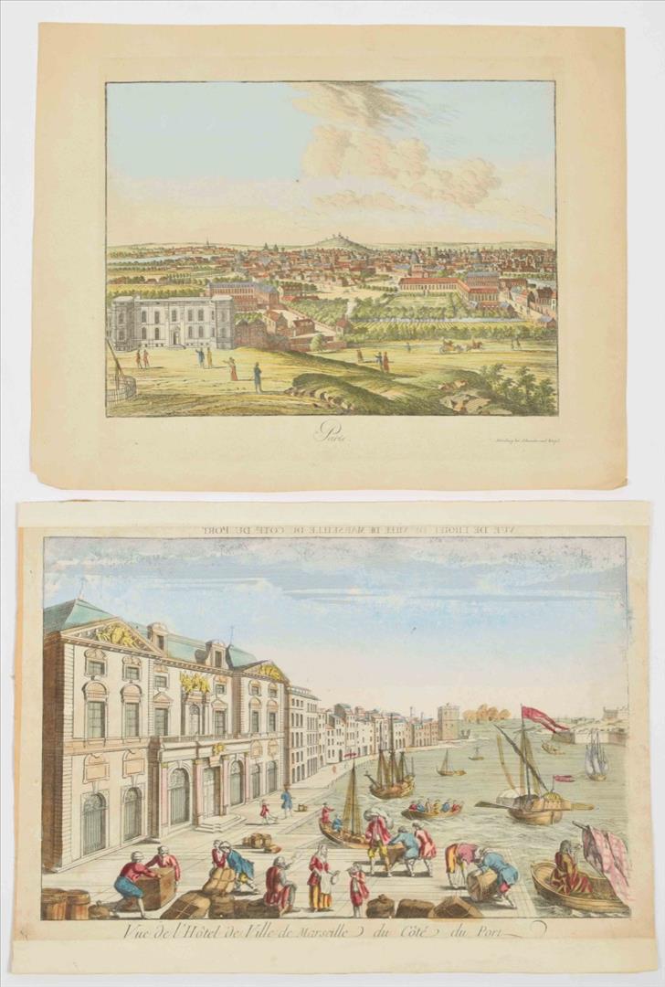 langs den Theems tot op de brug van Londen. Handcoloured engraved panoramic view of London by C. Philips junior. Tirion, 1753. Vertical folds as issued, sl. browned on one fold + view of All Saints Church in Oxford. Partly handcol. engraving after John Donowell (mirrored). No title or address. Border painted black. Mounted in passe-partout - and 20 more, mostly views related to France.