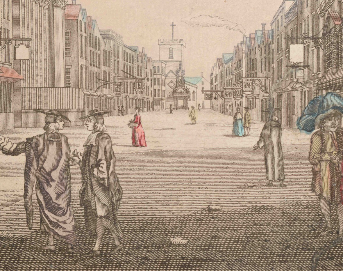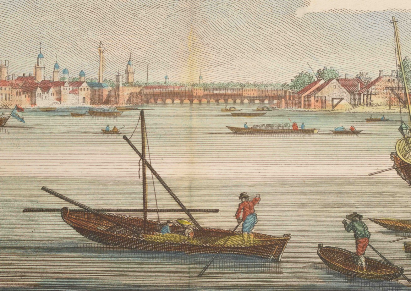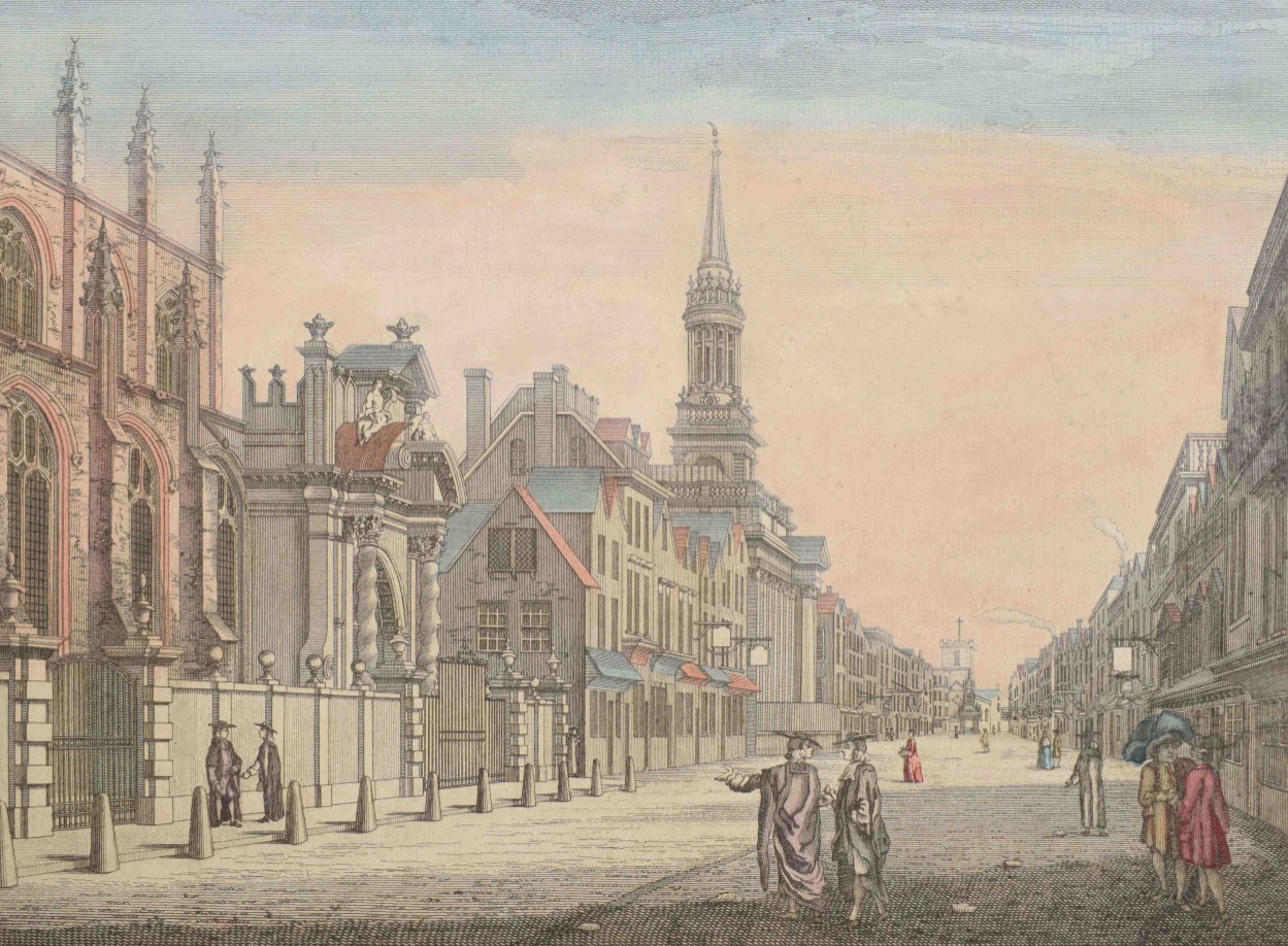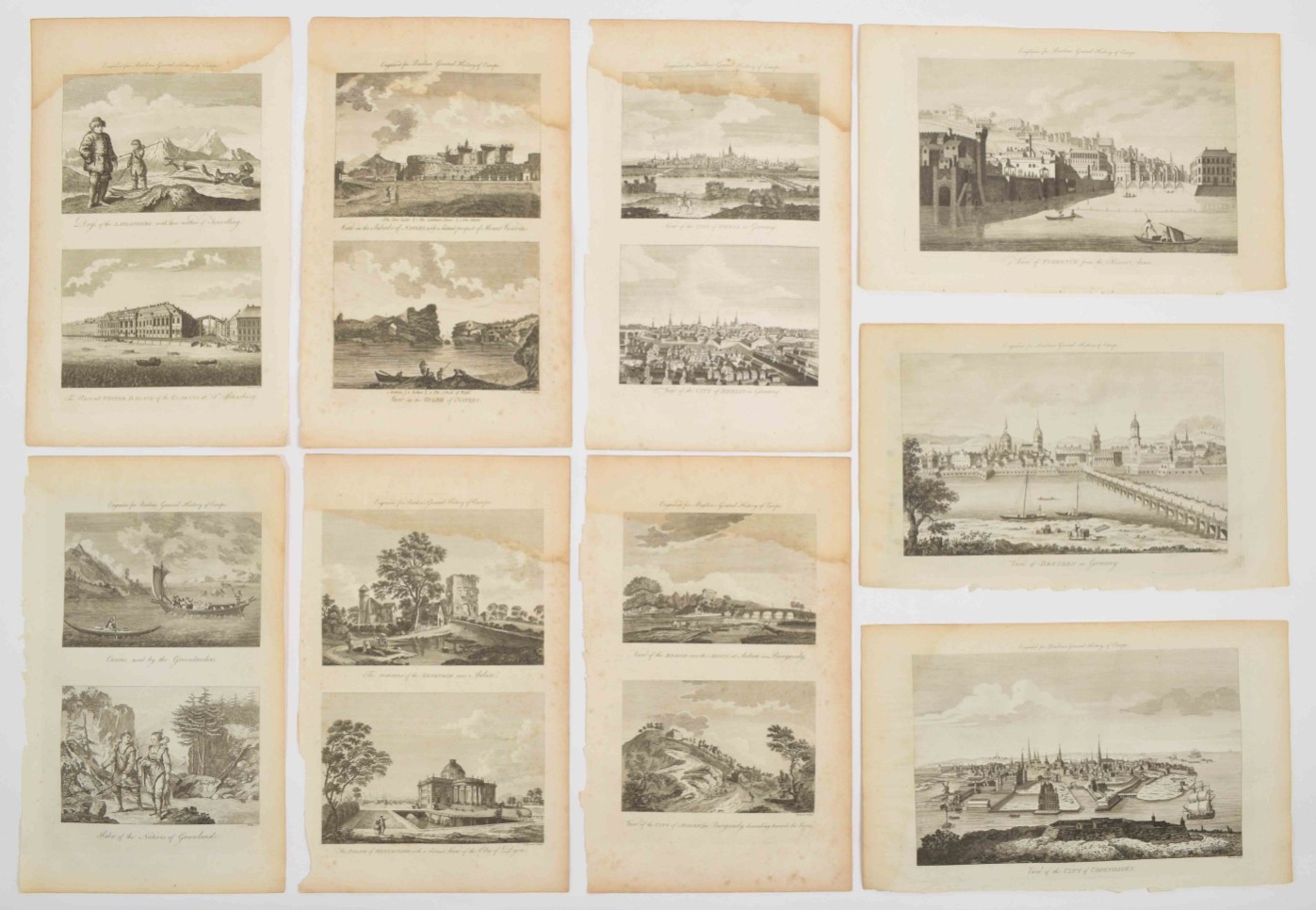 langs den Theems tot op de brug van Londen. Handcoloured engraved panoramic view of London by C. Philips junior. Tirion, 1753. Vertical folds as issued, sl. browned on one fold + view of All Saints Church in Oxford. Partly handcol. engraving after John Donowell (mirrored). No title or address. Border painted black. Mounted in passe-partout - and 20 more, mostly views related to France.