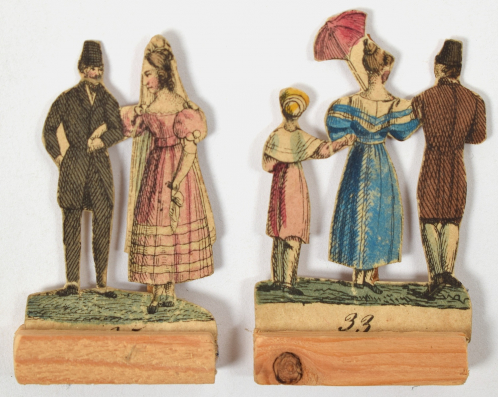 Germany, 1st half 19th century, all cut in shape and (except the very lowest) with wooden sticks pasted on reverse for reinforcement and (except a few) with the original (?) stands, smallest 4 x 2 cm., largest 17 x 11 cm.