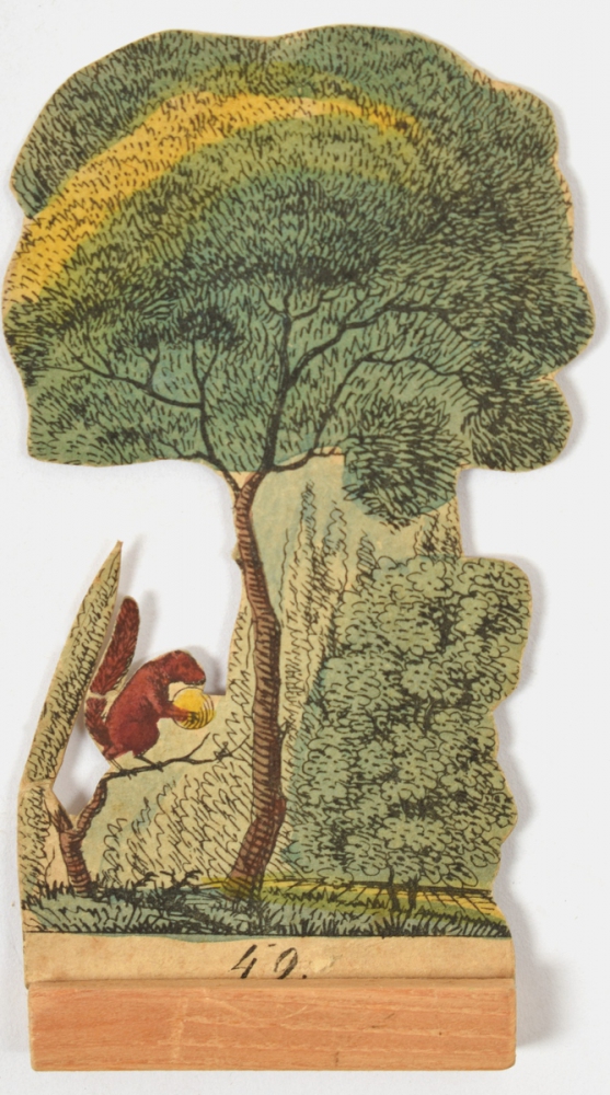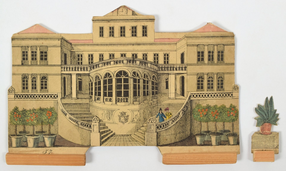 Extraordinary collection of used peepshow parts. Incl. children in various fairground attractions, a zoo, a farm, a palace with additional buildings, a "folly", an obelisk-shaped monument, and garden architecture and elements. Present are the following numbers: 1-3, 5, 6, 8, 11, 13, 15, 17, 19, 20, 21, 23-28, 30-35, 39, 40-45, 49, 52-54, 54, 58-58. Also 10 parts (9 cypresses and a flower pot) without number, with the sticks of the trees sharpened to place them in a stand together with another part. (total 49)