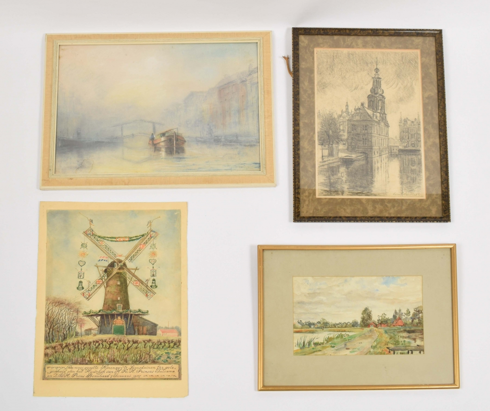 (2) (Munttoren Amsterdam). Drawing in black chalk, signed bottom right, 32 x 20 cm., framed in mount. And with 2 unsigned, framed other works by the same. (total 4)
