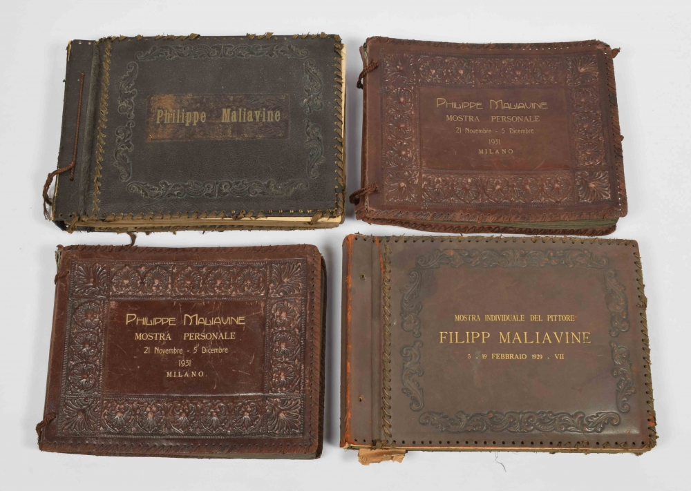 Extensive documentation in photos, apparently of the paintings and drawings exhibited at the aforementioned exhibition in Milan. The Russian-born artist Malyavin (known under various versions of this name) mostly painted the sunnier side of peasant life, in the form of laughing women in traditional costume. The new Soviet regime had a deeply anti-religious attitude, which must have greatly contributed to the departure of the deeply religious Malyavin to Nice, shortly after 1922. He worked and lived there until his death. With: (3-4): Two similar (slightly worn) albums of the same size and with the same address of the photographer on label on the inside: 1x of a solo exhibition from 5 to 19 February 1929 (title in Italian on front board), with 64 photos (contents tender) and 1x with only the name of the artist on the front board, with 92 photos mostly also appearing in the other albums (contents partly tender). In one of the albums a bifolium with Russian text signed by 8 persons and dated 18/V 39. Together with the luxurious finishing, this raises the possibility that these concern albums from the personal possessions of the artist. (total 4)