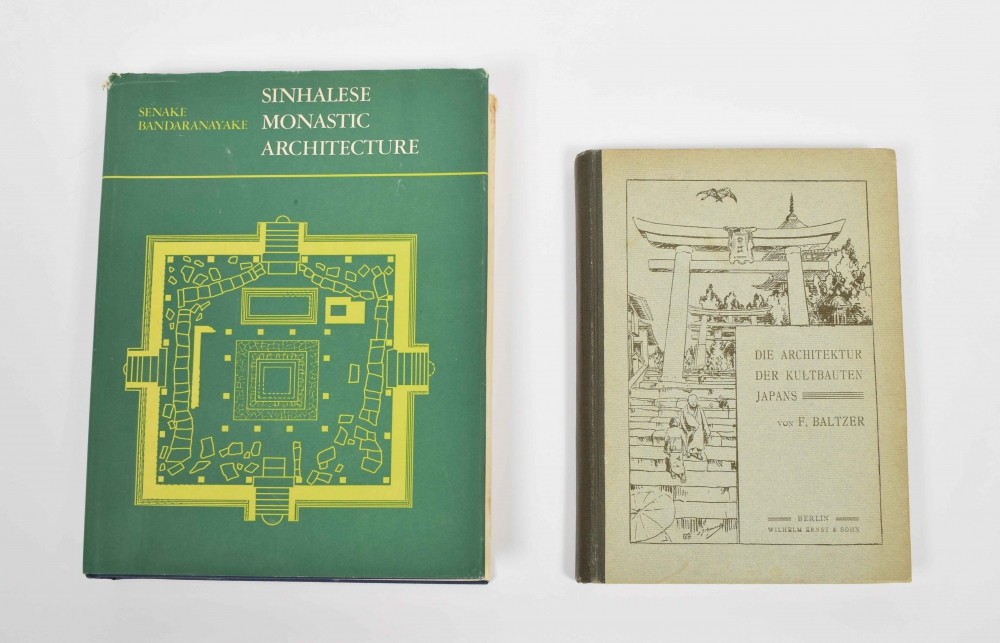 1) Die Architektur der Kultbauten Japans. F. Baltzer. Berlin, Wilhelm Ernst & Sohn, 1907. VI, 355 pp. In halfcloth. Clean copy. With: 2) Sinhalese Monastic Architecture. Senake Bandaranayake, Brill, Leiden, 1974. XVII, 403 pp. 55 plates. Bound with dust jacket.
