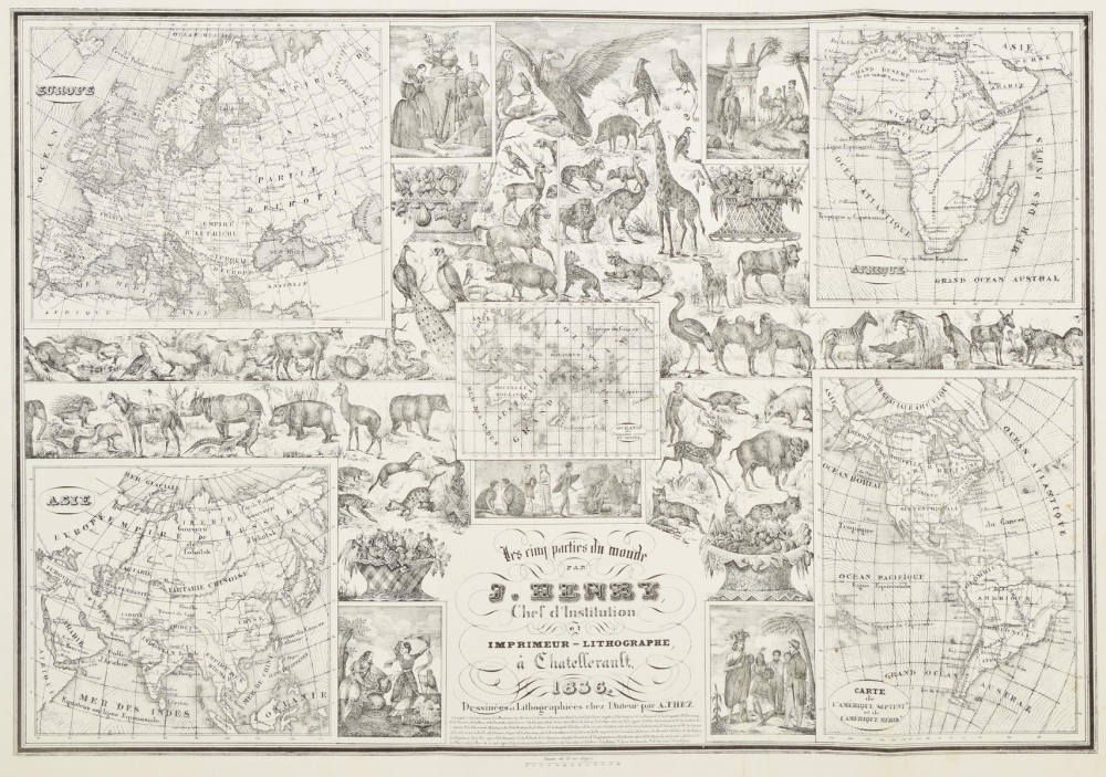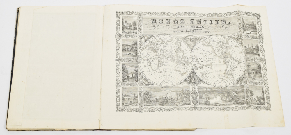 suivi d'un traité sur le monde entier. Ornée des 95 cartes et approuvée de l'Université. Pa J. Henry. 5e edition, revue, corrigée et augmentéé par l'auteur. Par J. Henry. No place or publisher, 1842, 2 parts in 1 vol., part 1 entirely lithographed with frontispiece, title page, map of France, 43 leaves printed on both sides with 86 maps below portraits and inside extensive text, followed by a folding map of the continents around images of their characteristic animals and peoples (dated 1836), finally a folding world map inside 10 border view (dated 1835) and the Notice sur le monde entier, (2) p., contemporary gilt halfleather, folio.