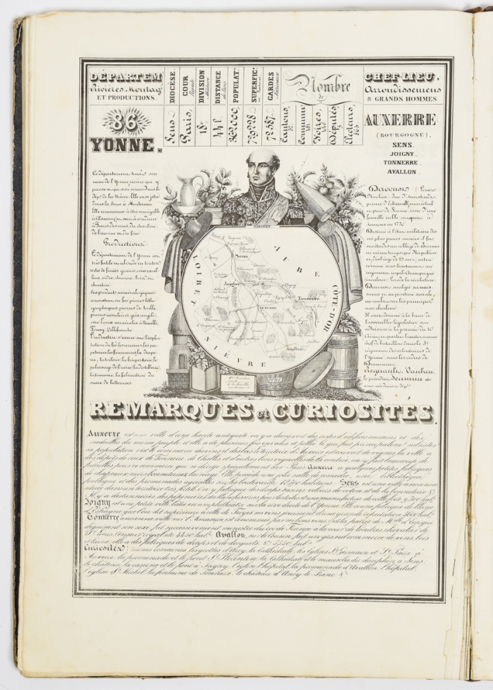 Bound with: (2) Histoire de France, depuis Pharamond jusqu'à Louis-Philippe 1er (420-1842). No place or publisher, 1842, (42) p., with lithographed title page and 72 portraits with extensive captions. Contents of both works occ. tender and with mild staining, some edgewear. Ad (1): Lovely atlas with a highly extraordinary, simultaneously decorative and informative approach. Ad (2) Complete history of France on the basis of the lives of the rulers of France, with their portraits.