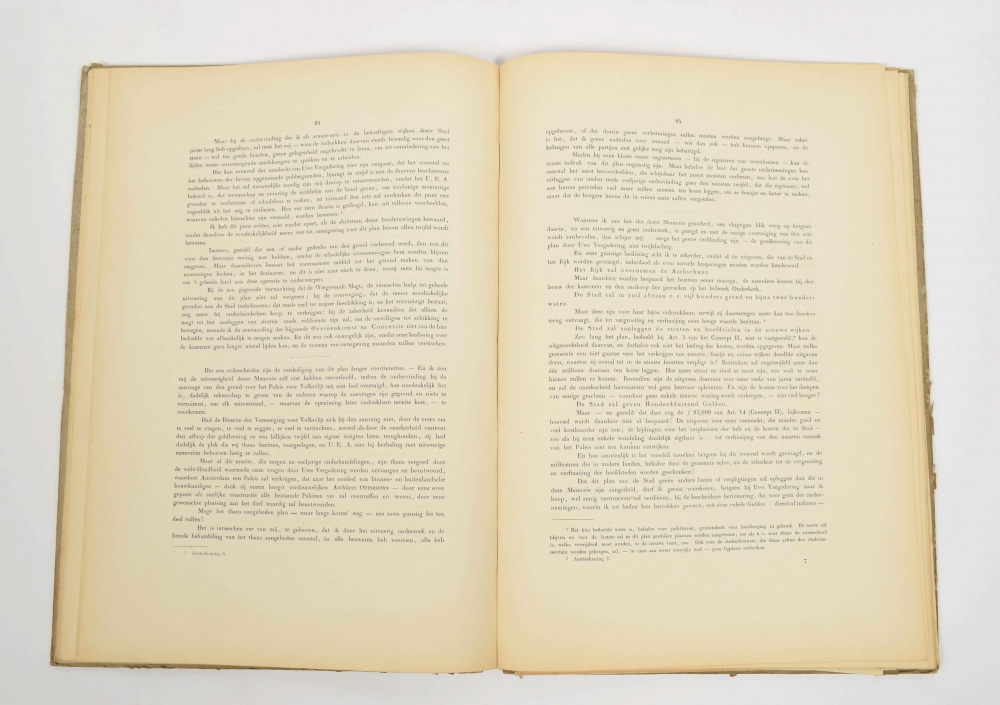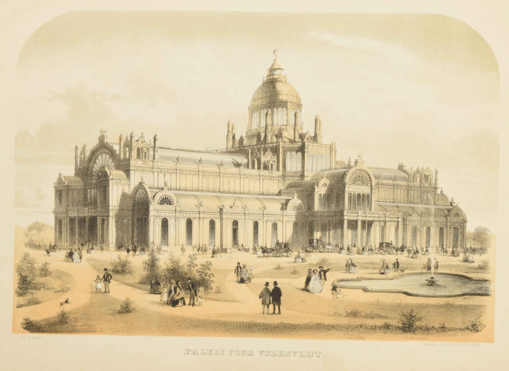 Folio, cased, colour lithograph of the Paleis voor Volksvlijt (Palace of Popular Diligence) by P. Blommers after C.C.A. Last, 39 pp.; with 4 separate site drawings. Added 2 prospectuses with a large steel engraving for the construction of the Amstel Hotel close to the Paleis voor Volksvlijt + 4 text pages on the Paleis from Nederlandsch Magazijn. Spine head with dam., else good.